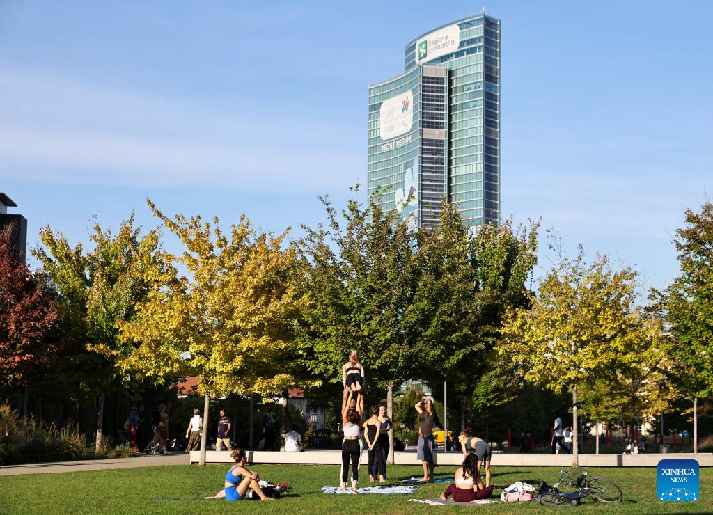 People practice acrobatic yoga at a park near the Lombardy Building in Milan, Italy, Sept. 17, 2025. The Milan-Cortina 2026 Olympic Winter Games will open on February 6, 2026 at Milan's San Siro Stadium. (Xinhua/Li Jing)