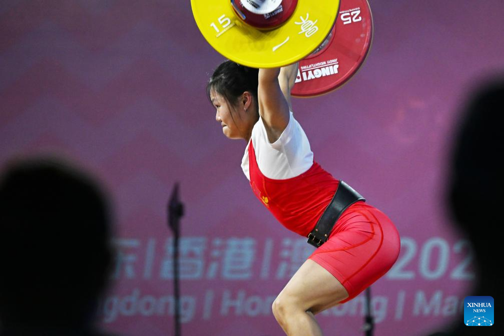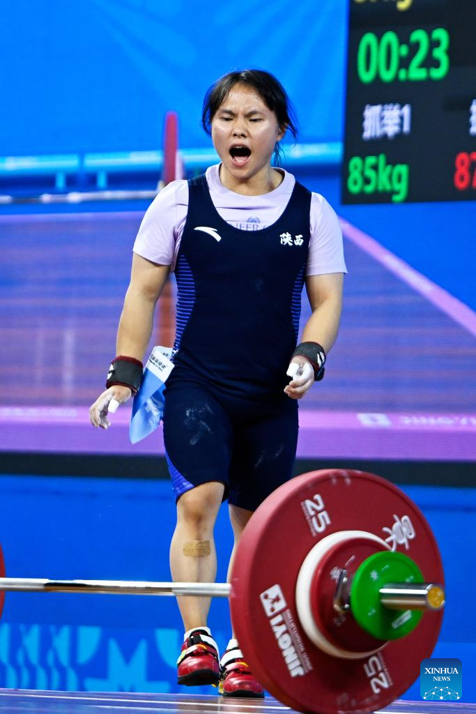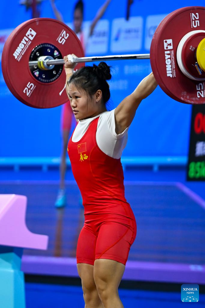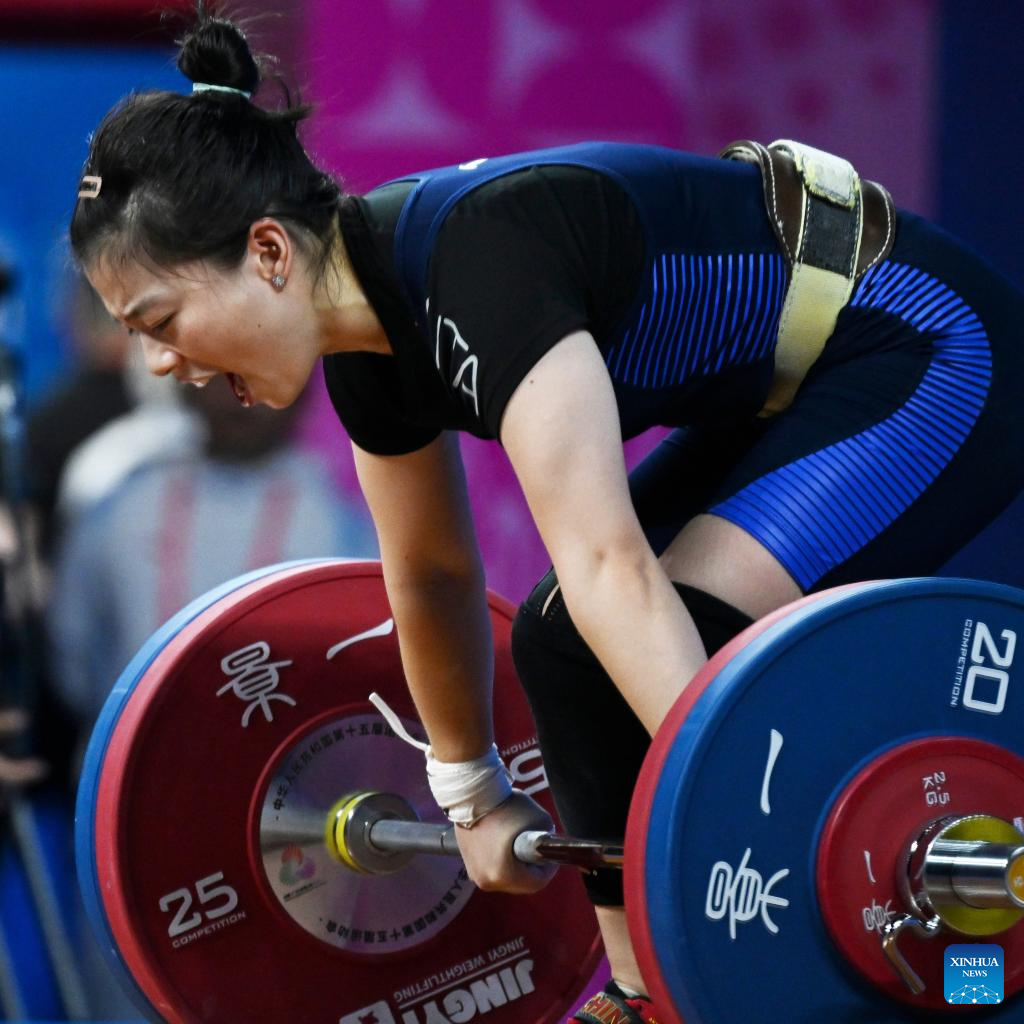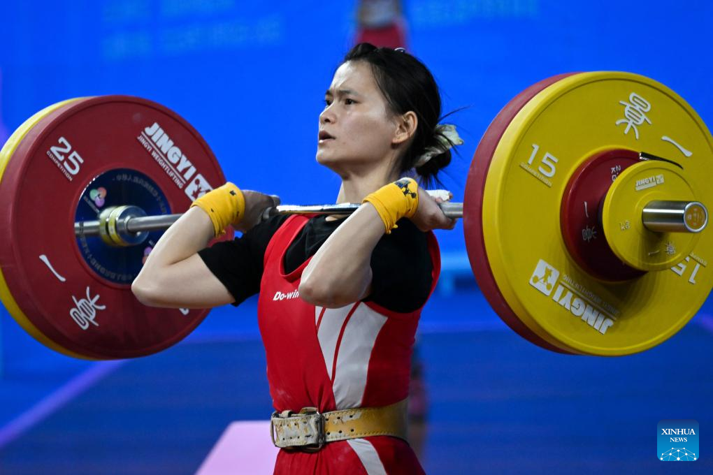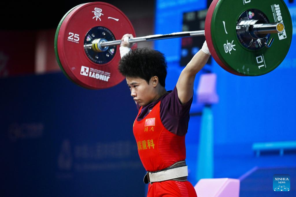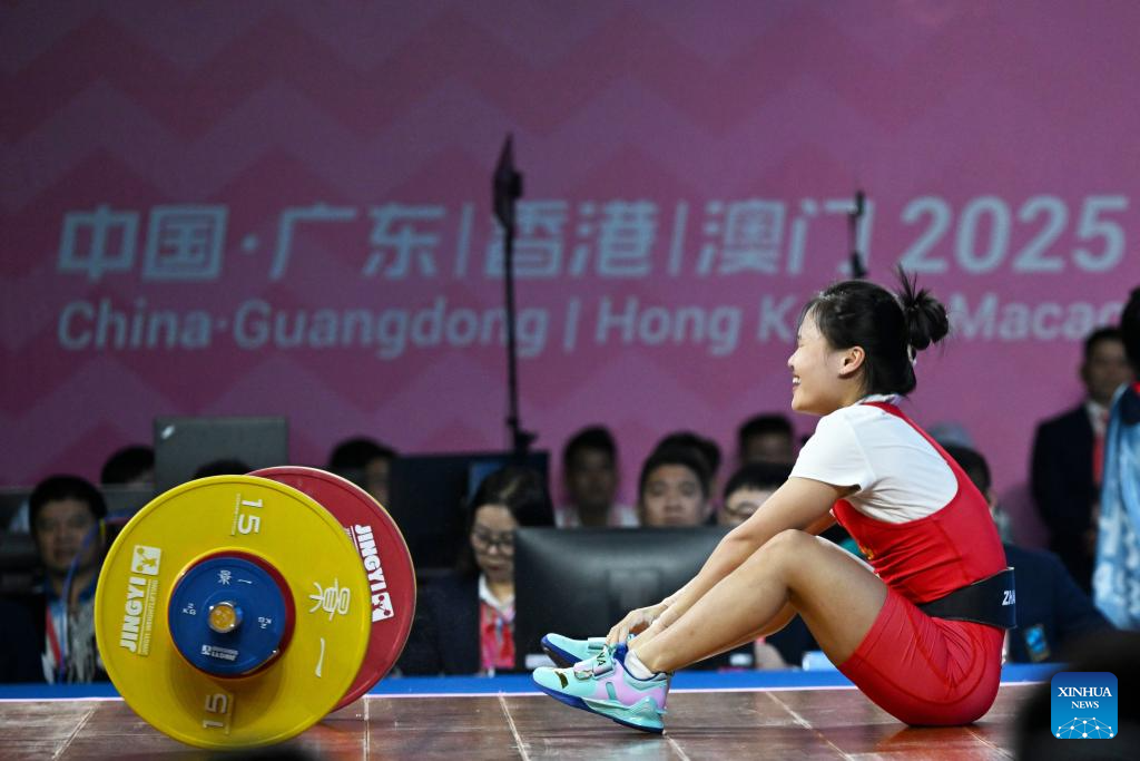 Hou Zhihui of Hunan competes in snatch during the weightlifting women's 49kg final at China's 15th National Games in Dongguan, south China's Guangdong Province, Nov. 10, 2025. (Xinhua/Yang Chenguang)