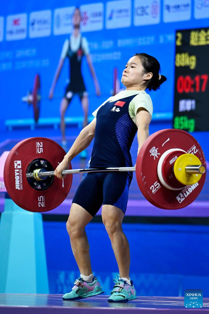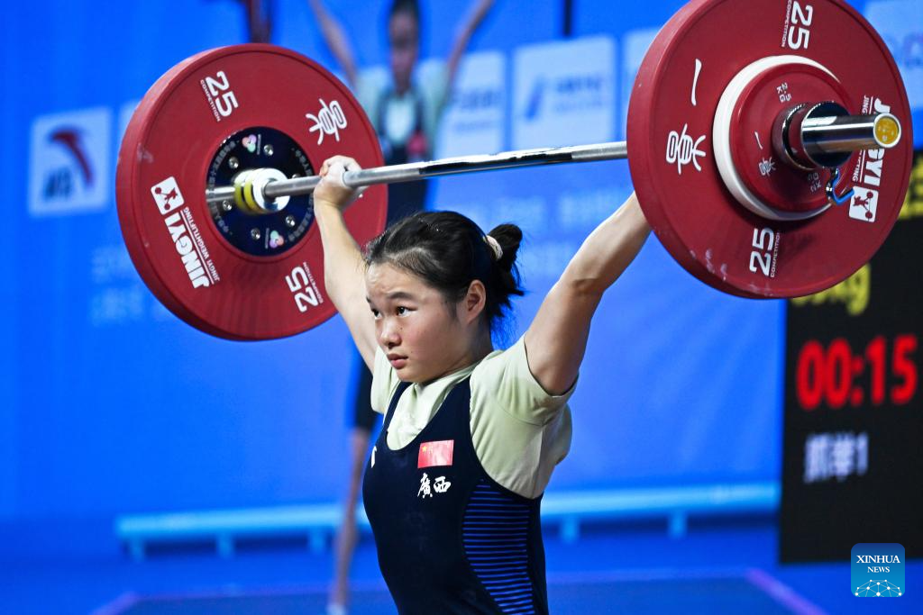 Zhao Jinhong of Guangxi competes in snatch during the weightlifting women's 45kg final at China's 15th National Games in Dongguan, south China's Guangdong Province, Nov. 10, 2025. (Xinhua/Yang Chenguang)