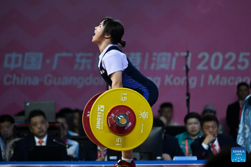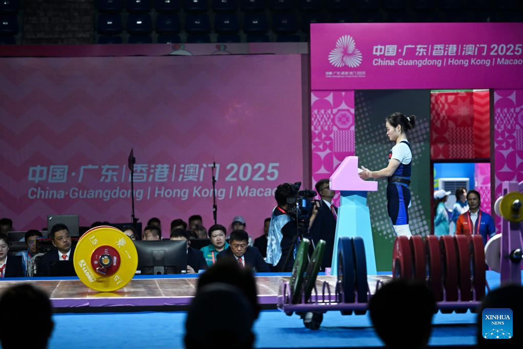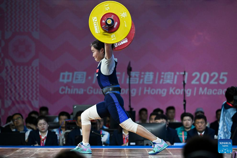 Zhao Jinhong of Guangxi competes in clean and jerk during the weightlifting women's 45kg final at China's 15th National Games in Dongguan, south China's Guangdong Province, Nov. 10, 2025. (Xinhua/Yang Chenguang)