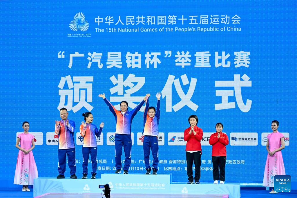 Gold medalist Zhao Jinlan of Guangxi, silver medalist Zhao Jinhong of Guangxi and bronze medalist Chen Yarou of Shaanxi pose during the awarding ceremony for the weightlifting women's 45kg final at China's 15th National Games in Dongguan, south China's Guangdong Province, Nov. 10, 2025. (Xinhua/Yang Chenguang)