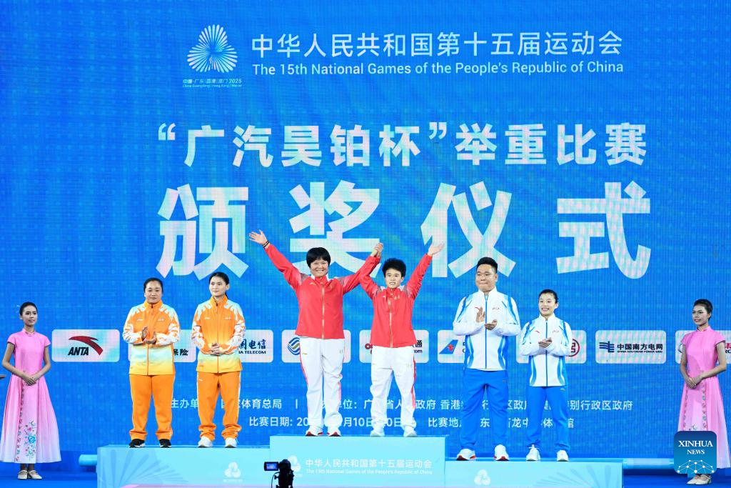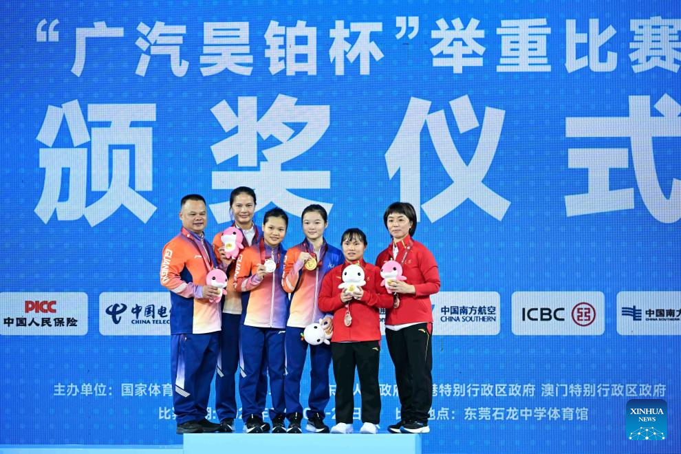 Gold medalist Hou Zhihui of Hunan, silver medalist Deng Xiaofang of Hainan, bronze medalist Yu Mengqian of Zhejiang and their coaches pose during the awarding ceremony for the weightlifting women's 49kg at China's 15th National Games in Dongguan, south China's Guangdong Province, Nov. 10, 2025. (Xinhua/Yang Chenguang)
