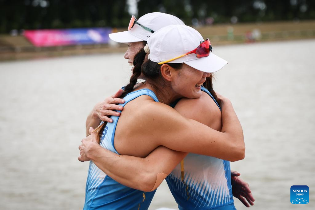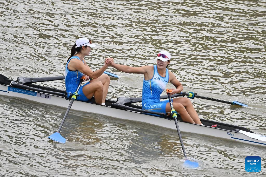Chen Yunxia/Zhang Ling of Shanghai celebrate after winning the women's double sculls final of rowing at China's 15th National Games in Guangzhou, south China's Guangdong Province, Nov. 11, 2025. (Xinhua/Xiao Ennan)