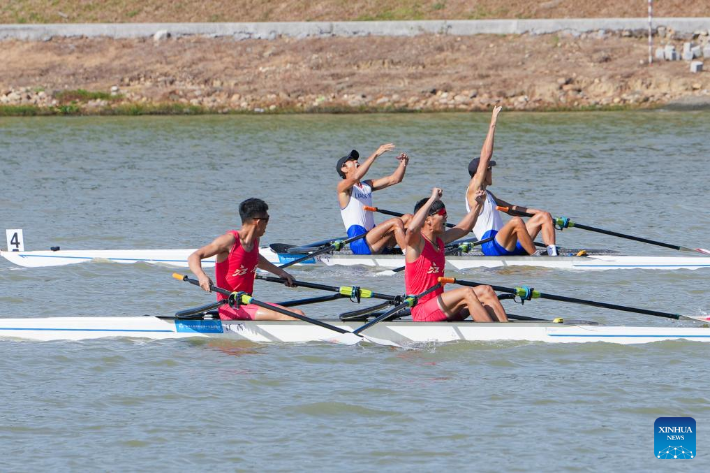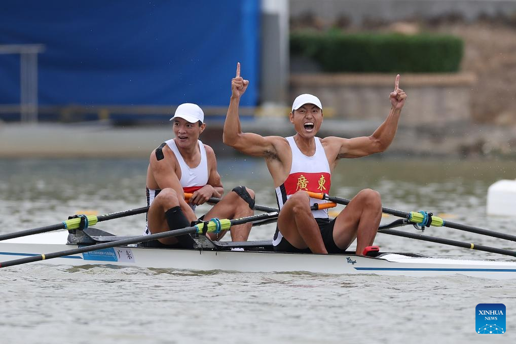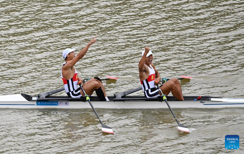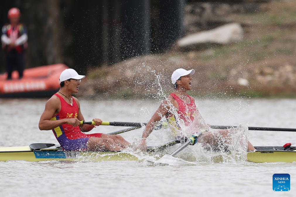 Cui Binghui/Bian Shihao of Henan celebrate after winning the men's pair final of rowing at China's 15th National Games in Guangzhou, south China's Guangdong Province, Nov. 11, 2025. (Xinhua/Pan Yulong)