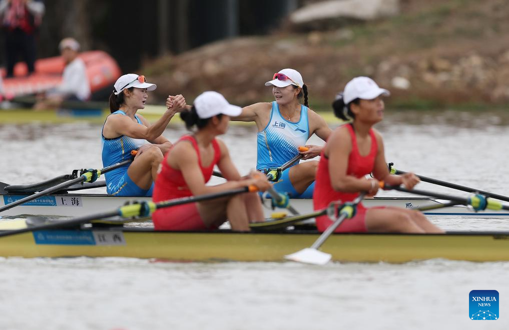 Chen Yunxia/Zhang Ling of Shanghai (back) celebrate after winning the women's double sculls final of rowing at China's 15th National Games in Guangzhou, south China's Guangdong Province, Nov. 11, 2025. (Xinhua/Pan Yulong)