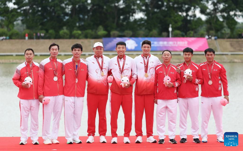 Gold medalists Ni Xulin/Nie Yide of Guangdong (C), silver medalists Yin Xudi/Zhang Liang (L) of Hunan and bronze medalists Zhao Chao/Li Linfu of Guizhou pose with their coaches during the awarding ceremony after the men's double sculls final of rowing at China's 15th National Games in Guangzhou, south China's Guangdong Province, Nov. 11, 2025. (Xinhua/Pan Yulong)