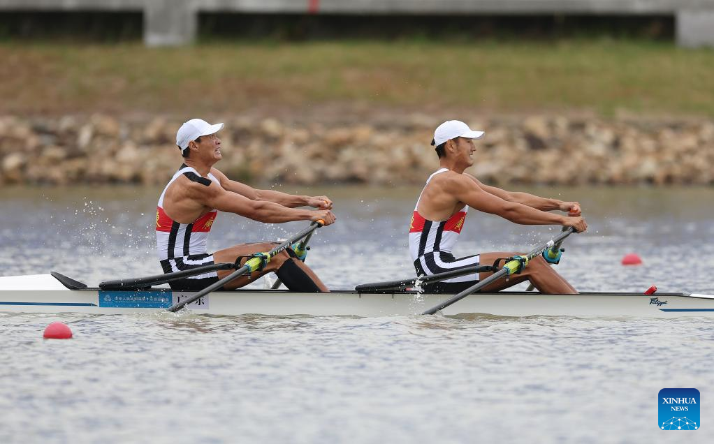 Ni Xulin/Nie Yide of Guangdong compete during the men's double sculls final of rowing at China's 15th National Games in Guangzhou, south China's Guangdong Province, Nov. 11, 2025. (Xinhua/Pan Yulong)