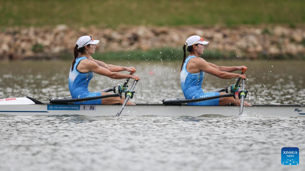 Chen Yunxia (L)/Zhang Ling of Shanghai compete during the women's double sculls final of rowing at China's 15th National Games in Guangzhou, south China's Guangdong Province, Nov. 11, 2025. (Xinhua/Pan Yulong)