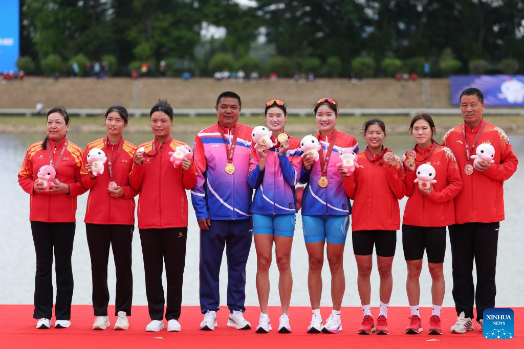 Gold medalists Chen Yunxia/Zhang Ling of Shanghai (C), silver medalists Xie Lingli/Zhang Xinyu of Jiangxi (L) and bronze medalists Wang Yuxin/Liu Yuanyuan of Jiangsu pose with their coaches during the awarding ceremony after the women's double sculls final of rowing at China's 15th National Games in Guangzhou, south China's Guangdong Province, Nov. 11, 2025. (Xinhua/Pan Yulong)