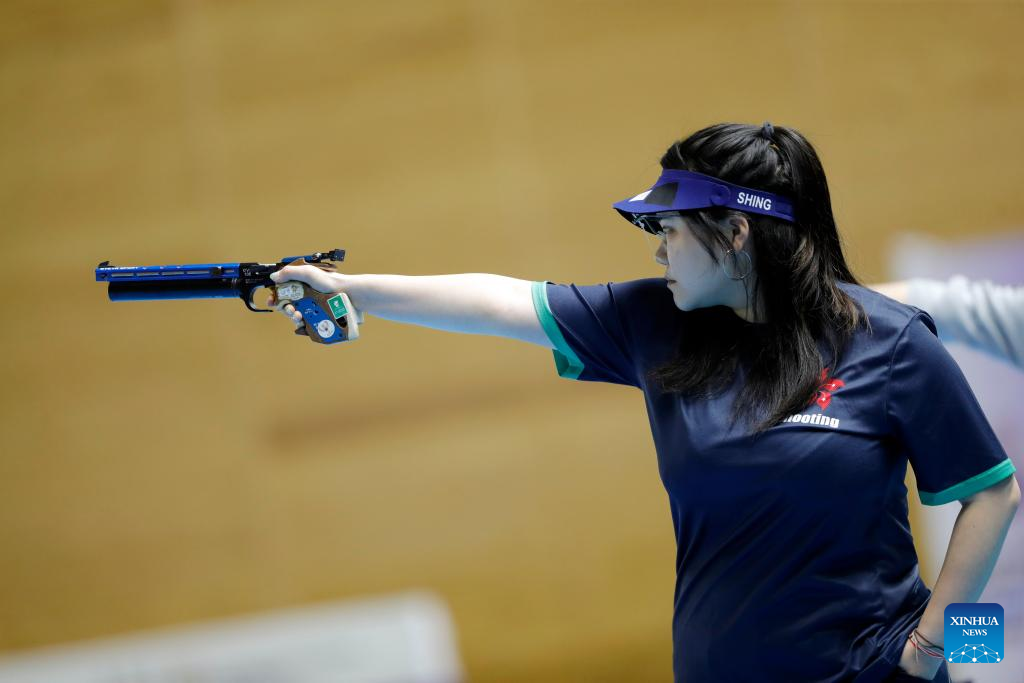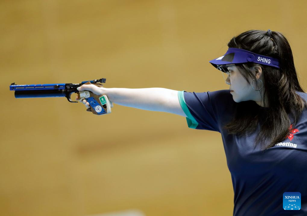 Shing Ho Ching of China's Hong Kong competes during the 10m air pistol women's final of shooting at the 2025 ISSF World Championship Rifle/Pistol in Cairo, Egypt, on Nov. 10, 2025. (Xinhua/Ahmed Gomaa)