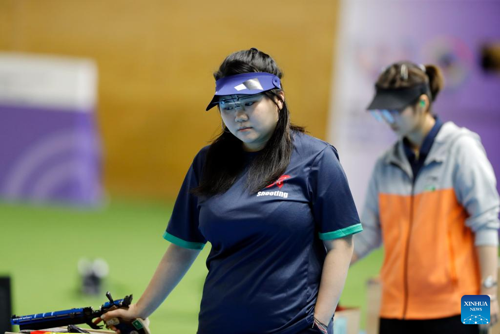 Shing Ho Ching (L) of China's Hong Kong is seen during the 10m air pistol women's final of shooting at the 2025 ISSF World Championship Rifle/Pistol in Cairo, Egypt, on Nov. 10, 2025. (Xinhua/Ahmed Gomaa)