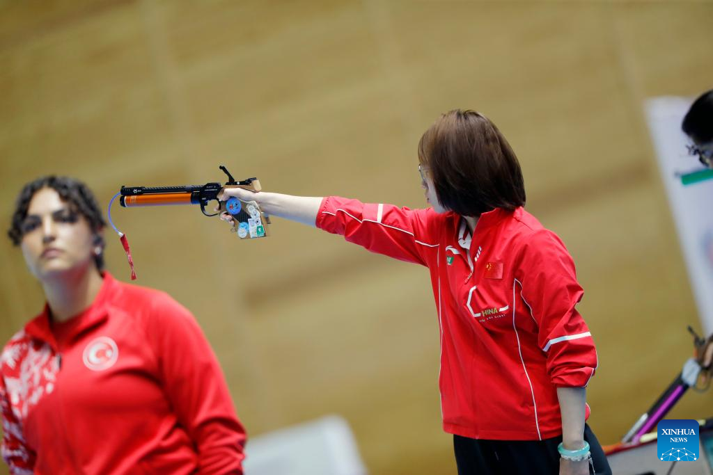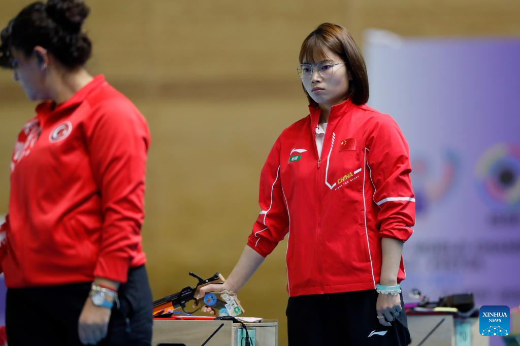 Qian Wei (R) of China is seen during the 10m air pistol women's final of shooting at the 2025 ISSF World Championship Rifle/Pistol in Cairo, Egypt, on Nov. 10, 2025. (Xinhua/Ahmed Gomaa)