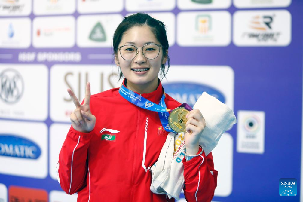 Yao Qianxun of China poses for a photo with gold medal after winning the 10m air pistol women's final of shooting at the 2025 ISSF World Championship Rifle/Pistol in Cairo, Egypt, on Nov. 10, 2025. (Xinhua/Ahmed Gomaa)