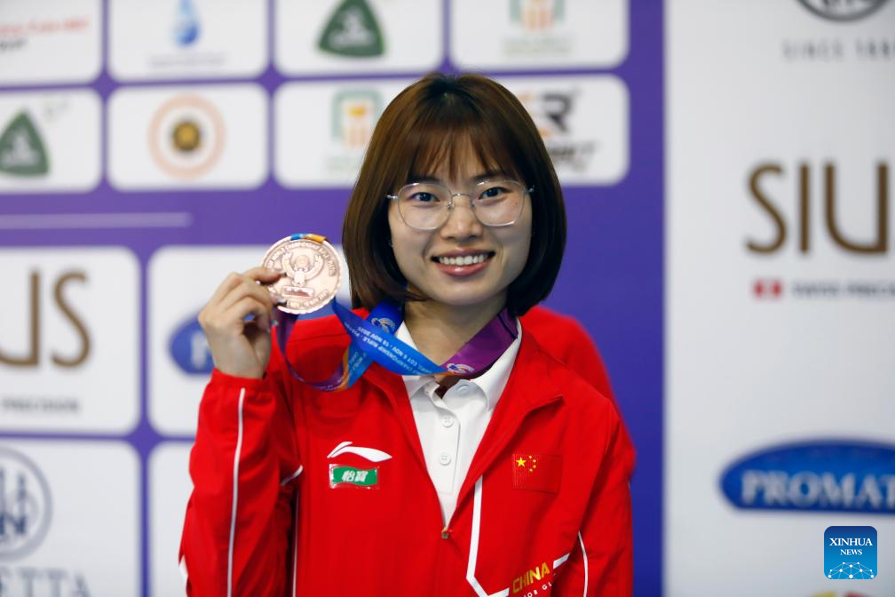 Qian Wei of China poses for photos with bronze medal during an awarding ceremony for the 10m air pistol women's final of shooting at the 2025 ISSF World Championship Rifle/Pistol in Cairo, Egypt, on Nov. 10, 2025. (Xinhua/Ahmed Gomaa)