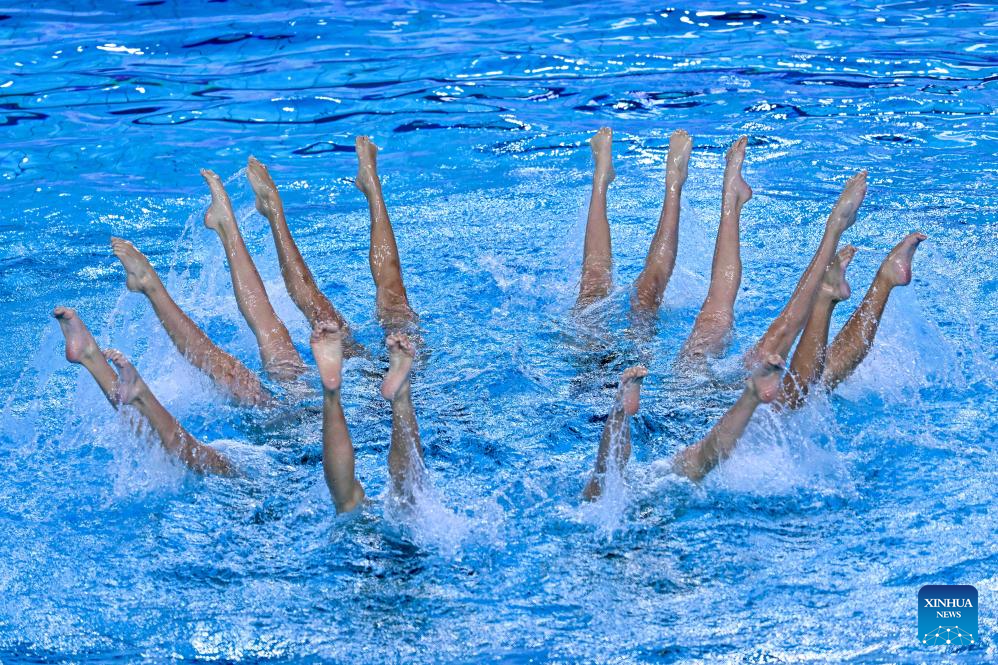 Team Beijing Sport University perform during the team technical of artistic swimming at China's 15th National Games in Jiangmen, south China's Guangdong Province, Nov. 13, 2025. (Xinhua/Li Xin)