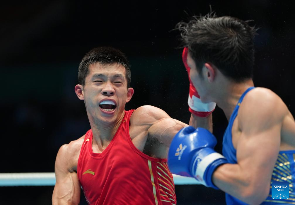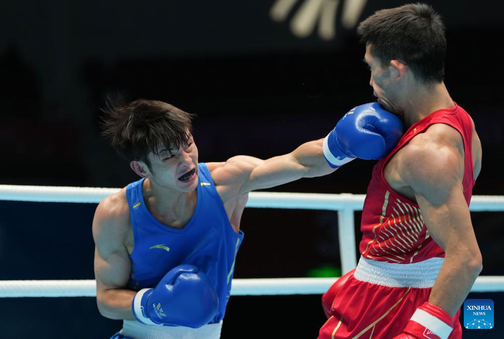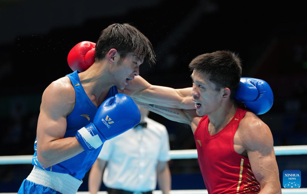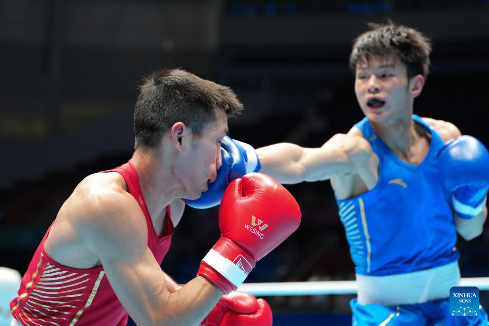 Lyu Ping (R) of Guizhou competes against Chen Xinlin of Guangdong during the men's 57kg final of boxing at China's 15th National Games in Shenzhen, south China's Guangdong Province, Nov. 13, 2025. (Xinhua/Peng Yikai)