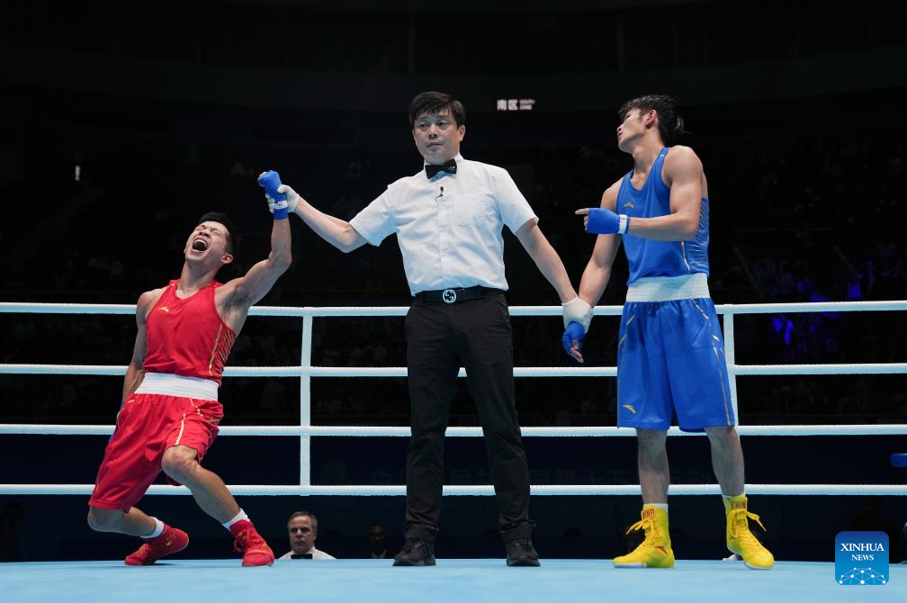 Lyu Ping (L) of Guizhou celebrates after defeating Chen Xinlin of Guangdong during the men's 57kg final of boxing at China's 15th National Games in Shenzhen, south China's Guangdong Province, Nov. 13, 2025. (Xinhua/Peng Yikai)