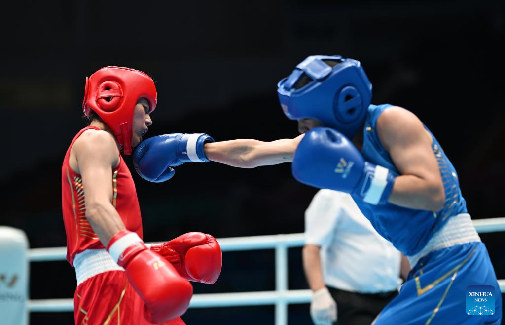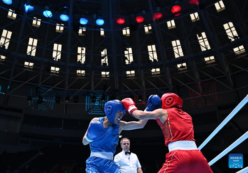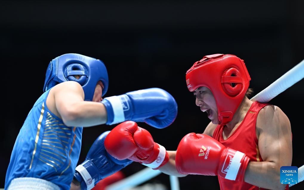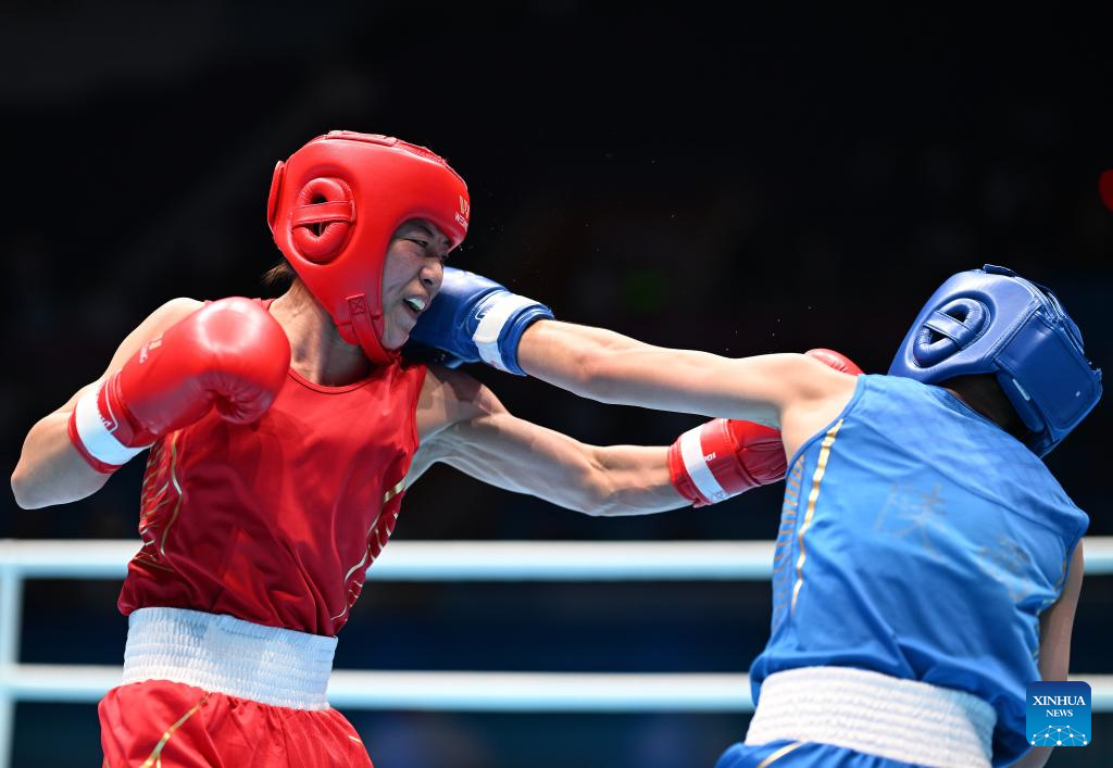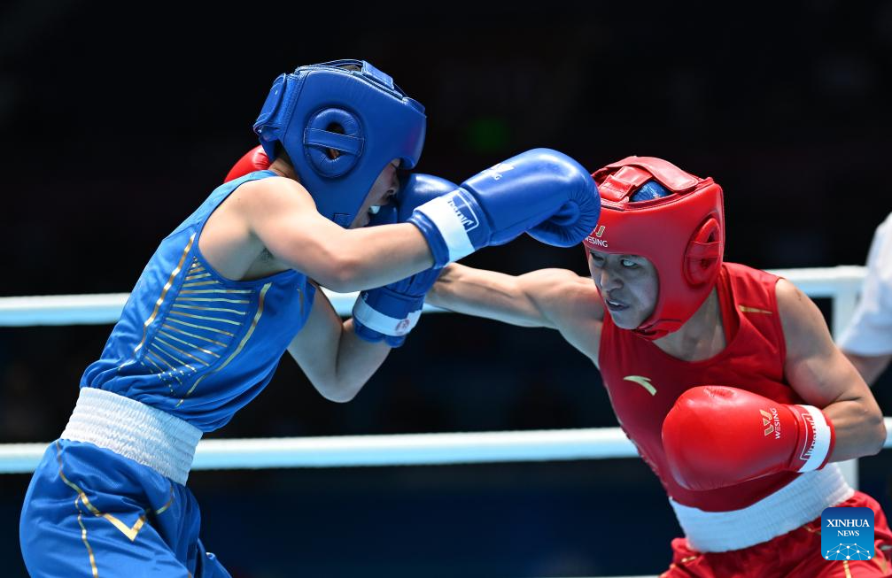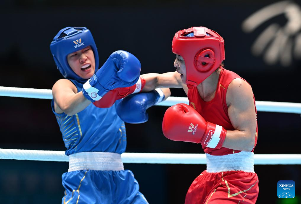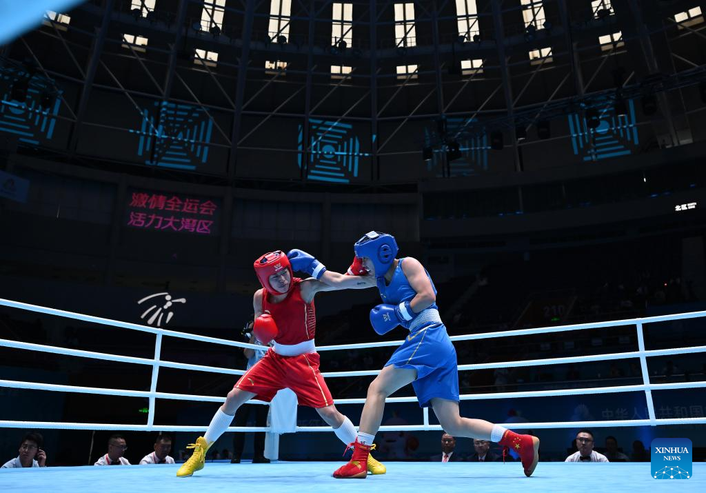 Wu Yu (R) of Beijing Sport University competes against Qi Xinyu of Xi'an Physical Education University during the women's 50kg final of boxing at China's 15th National Games in Shenzhen, south China's Guangdong Province, Nov. 13, 2025. (Xinhua/Yang Guanyu)