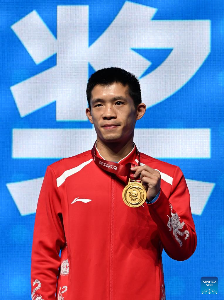 Gold medalist Lyu Ping of Guizhou poses during the awarding ceremony for the men's 57kg of boxing at China's 15th National Games in Shenzhen, south China's Guangdong Province, Nov. 13, 2025. (Xinhua/Yang Guanyu)