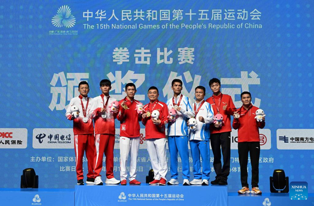 Gold medalist Lyu Ping (3rd L) of Guizhou, silver medalist Chen Xinlin (2nd L) of Guangdong and bronze medalists Chen Zhihao (4th R) of Zhejiang and Qian Jiahao (2nd R) of Chengdu Sport University pose with their coaches during the awarding ceremony for the men's 57kg of boxing at China's 15th National Games in Shenzhen, south China's Guangdong Province, Nov. 13, 2025. (Xinhua/Yang Guanyu)