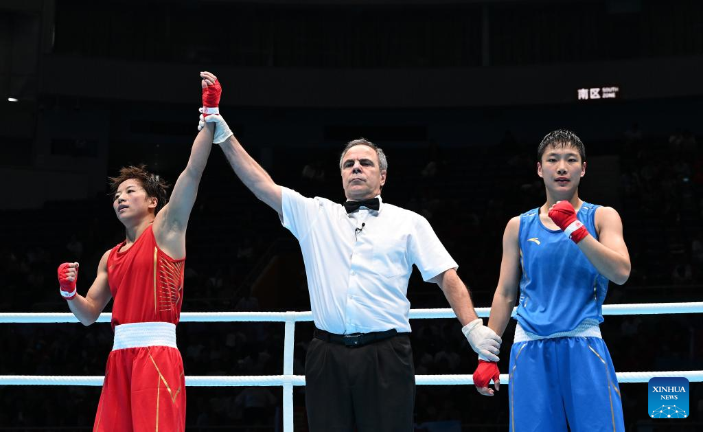 Wu Yu (L) of Beijing Sport University celebrates after defeating Qi Xinyu of Xi'an Physical Education University during the women's 50kg final of boxing at China's 15th National Games in Shenzhen, south China's Guangdong Province, Nov. 13, 2025. (Xinhua/Yang Guanyu)