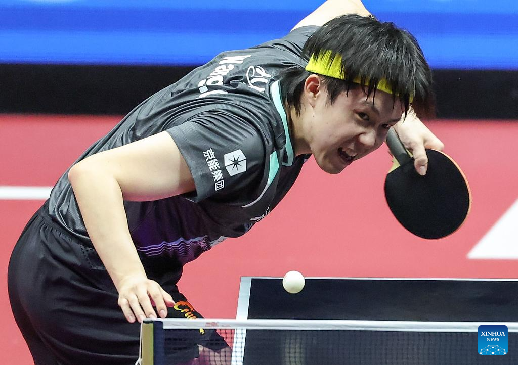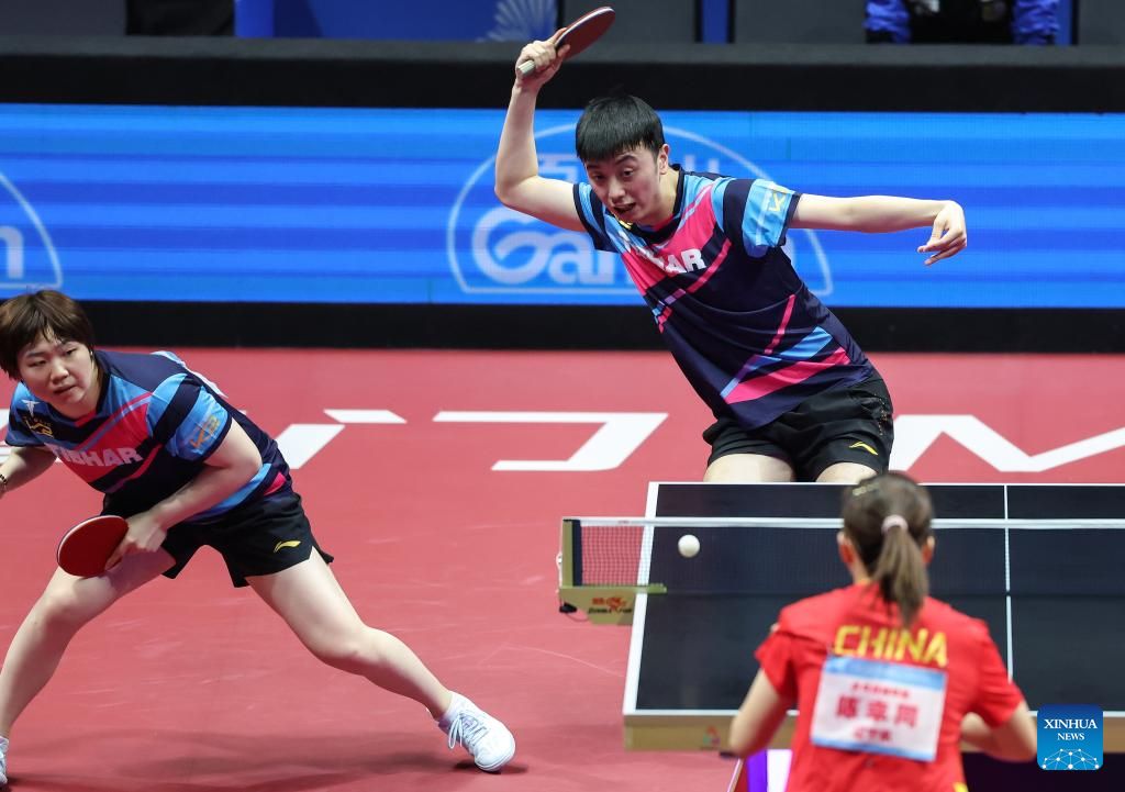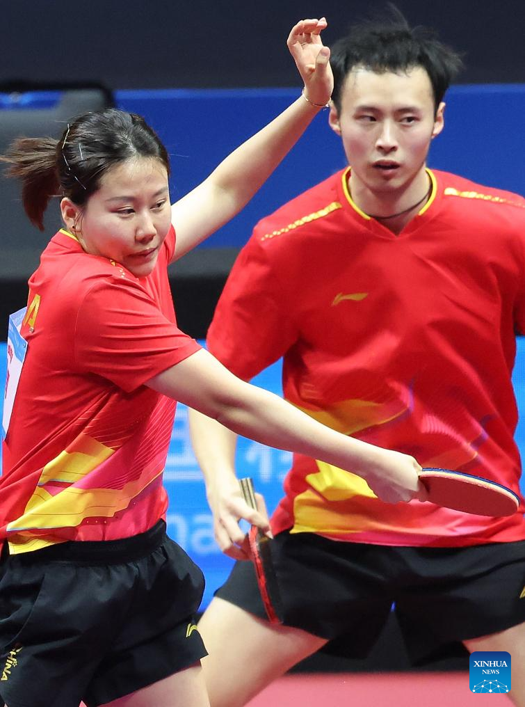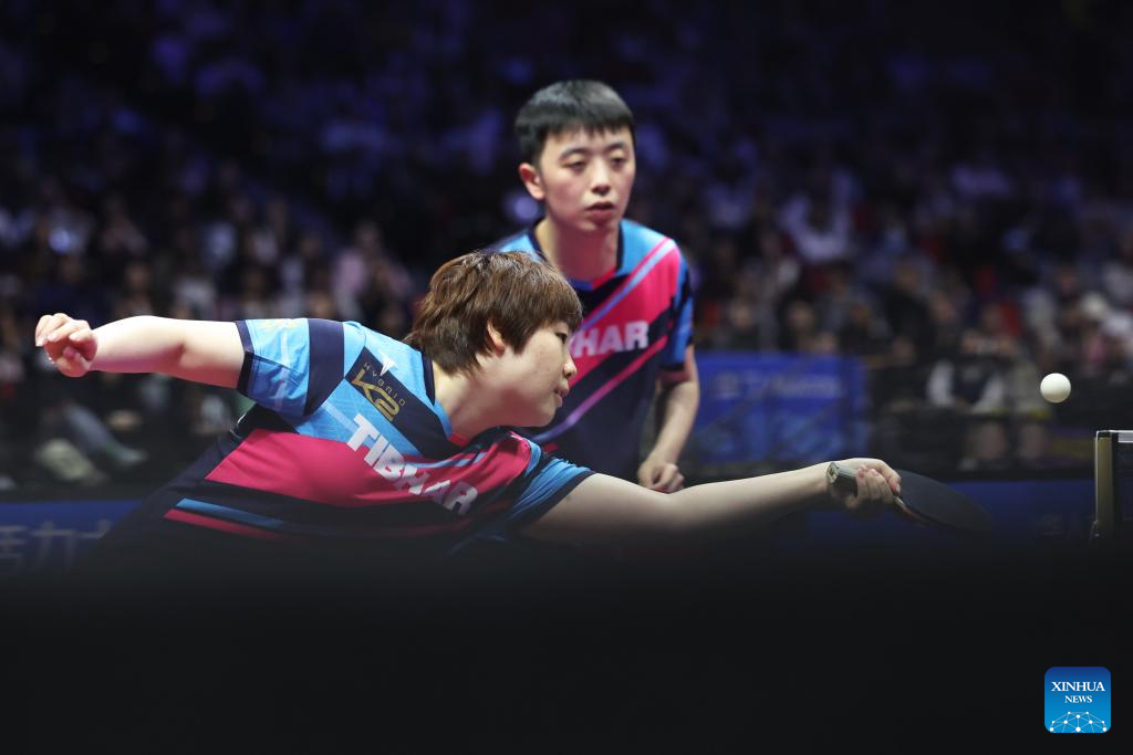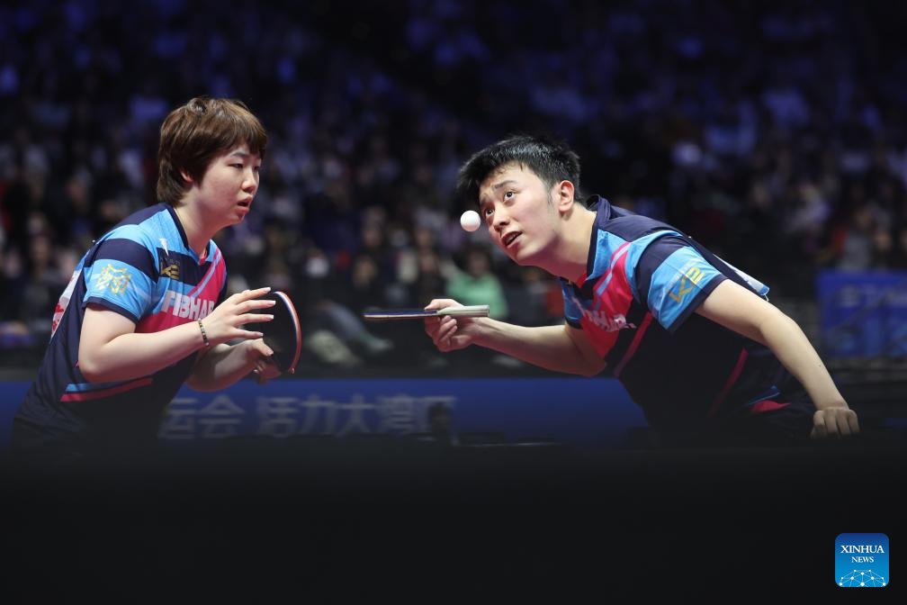 Chen Yuanyu (R)/Kuai Man compete during the table tennis mixed doubles semifinal match between Chen Xingtong/Xu Haidong of Liaoning and Chen Yuanyu/Kuai Man of Jiangsu at China's 15th National Games in Macao, south China, Nov. 13, 2025. (Xinhua/Chen Bin)