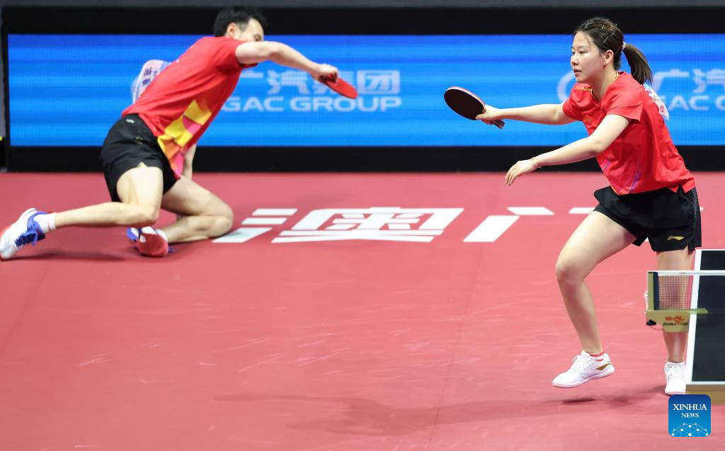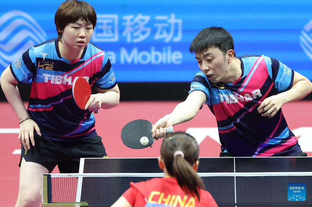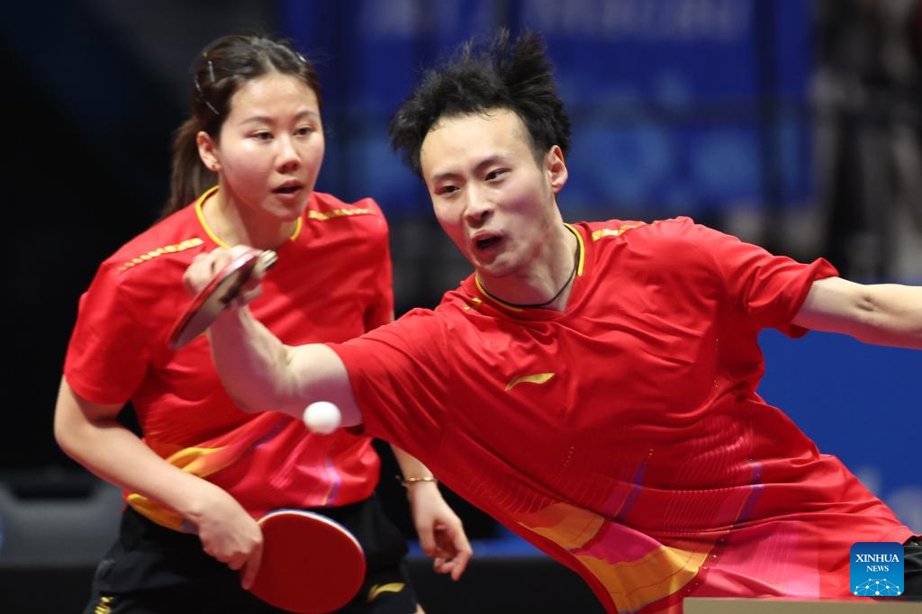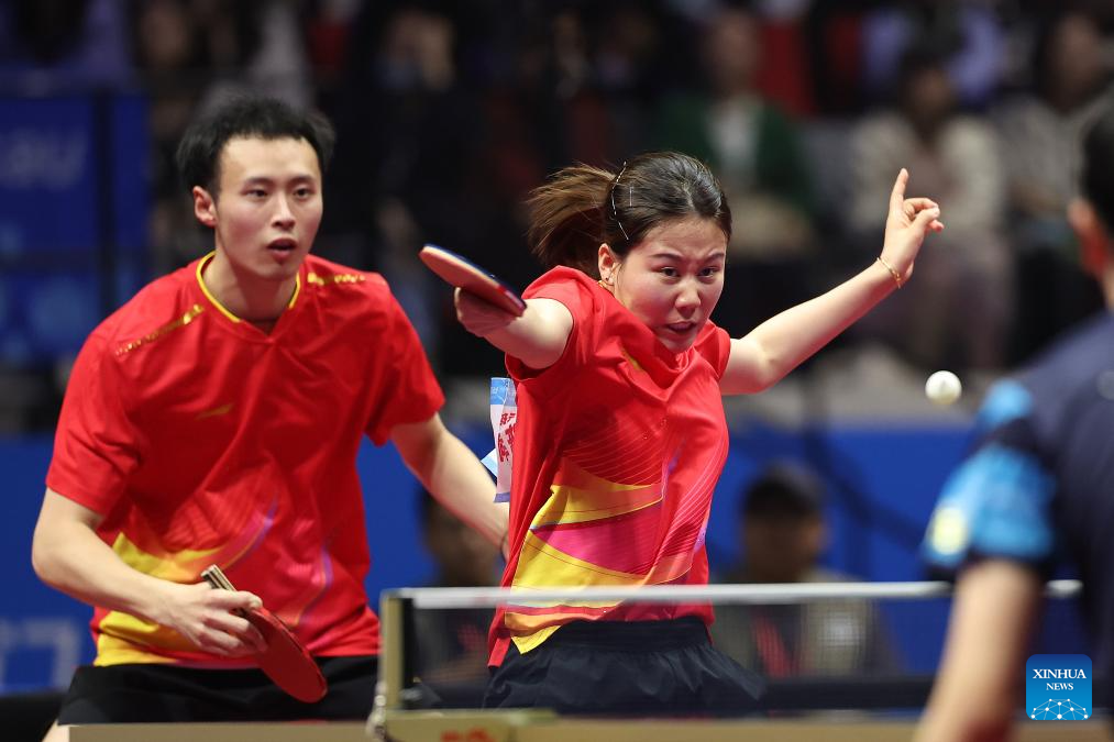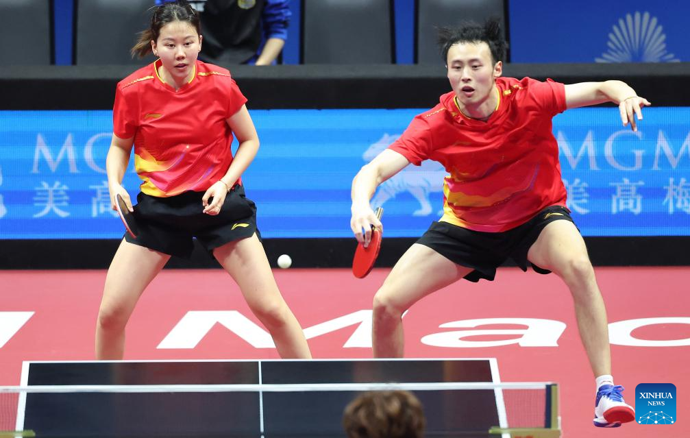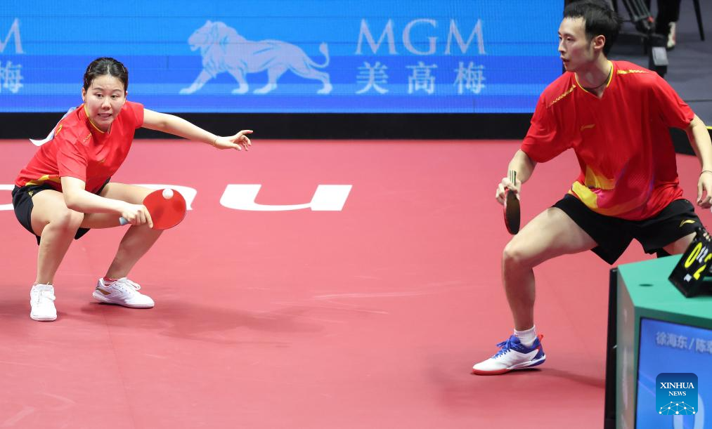 Chen Yuanyu/Kuai Man (front) compete during the table tennis mixed doubles semifinal match between Chen Xingtong/Xu Haidong of Liaoning and Chen Yuanyu/Kuai Man of Jiangsu at China's 15th National Games in Macao, south China, Nov. 13, 2025. (Xinhua/Chen Bin)