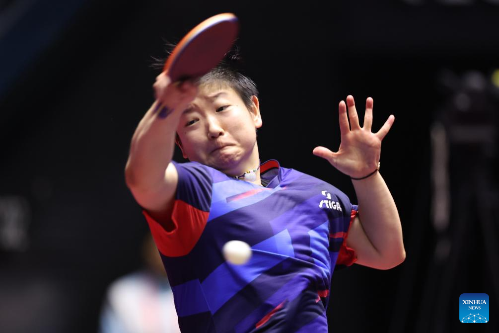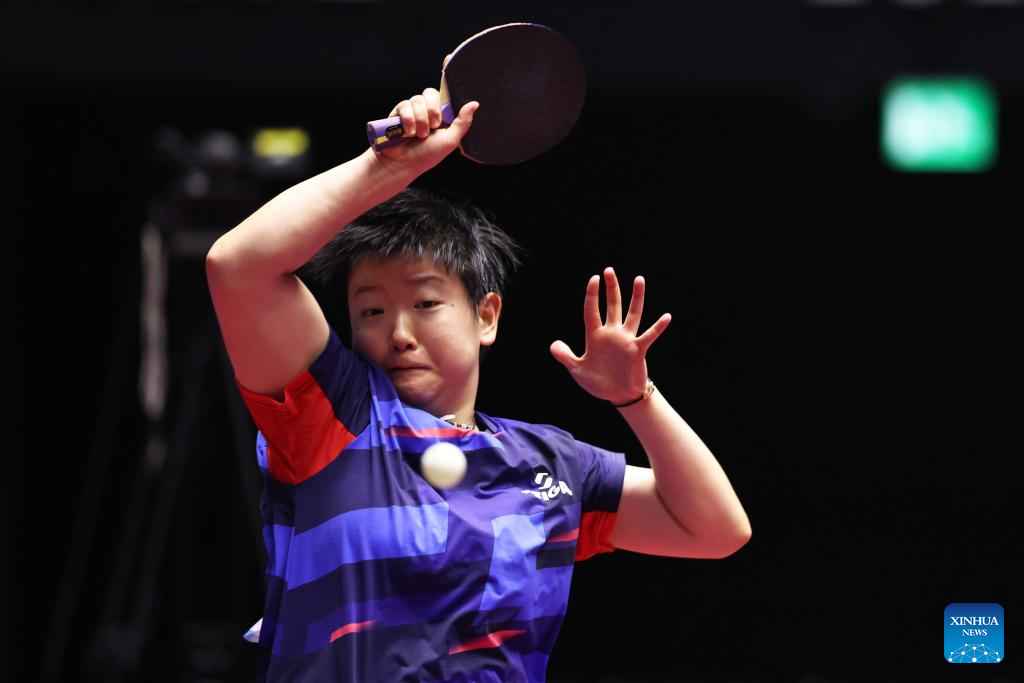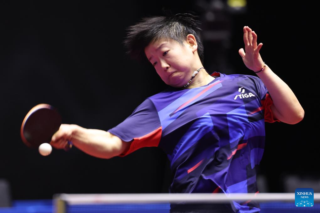 Sun Yingsha hits a return during the women's singles quaterfinal match of table tennis between Sun Yingsha of Hebei and Liu Fei of Liaoning at China's 15th National Games in Macao, south China, Nov. 13, 2025. (Xinhua/Chen Bin)