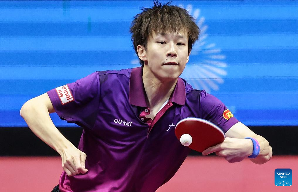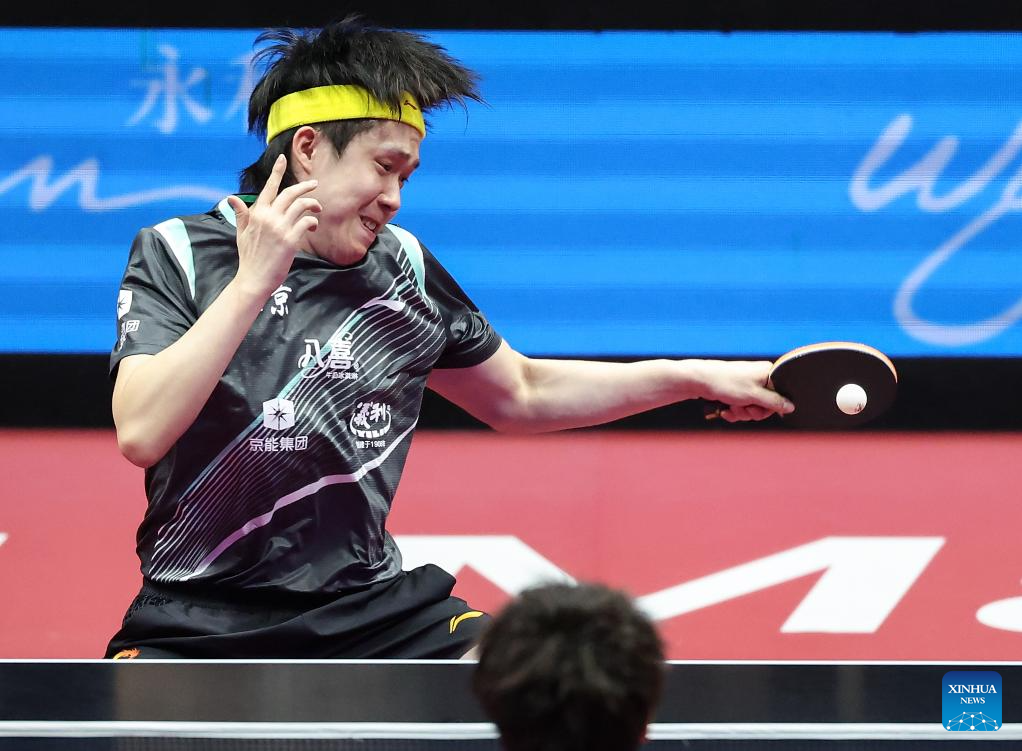 Wang Chuqin hits a return during the men's singles quaterfinal match of table tennis between Wang Chuqin of Beijing and Lin Gaoyuan of Guangdong at China's 15th National Games in Macao, south China, Nov. 13, 2025. (Xinhua/Liu Xu)