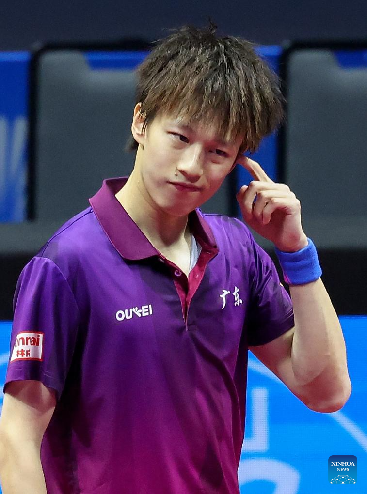 Lin Gaoyuan reacts during the men's singles quaterfinal match of table tennis between Wang Chuqin of Beijing and Lin Gaoyuan of Guangdong at China's 15th National Games in Macao, south China, Nov. 13, 2025. (Xinhua/Liu Xu)