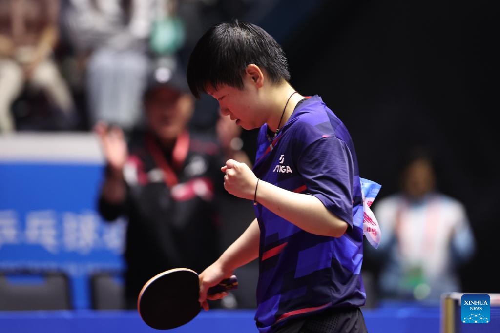 Sun Yingsha celebrates scoring during the women's singles quaterfinal match of table tennis between Sun Yingsha of Hebei and Liu Fei of Liaoning at China's 15th National Games in Macao, south China, Nov. 13, 2025. (Xinhua/Chen Bin)