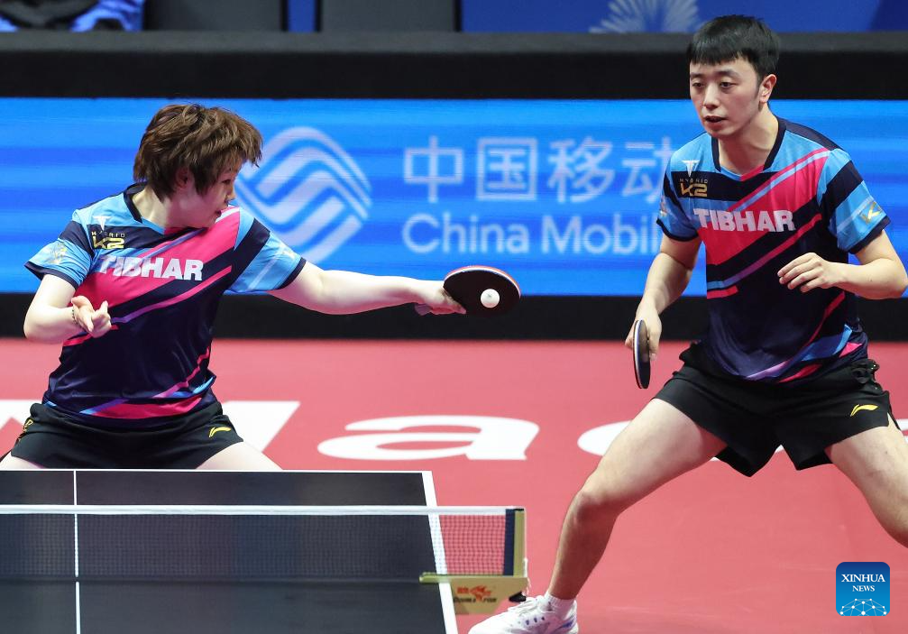 Chen Yuanyu (top R)/Kuai Man compete during the table tennis mixed doubles semifinal match between Chen Xingtong/Xu Haidong of Liaoning and Chen Yuanyu/Kuai Man of Jiangsu at China's 15th National Games in Macao, south China, Nov. 13, 2025. (Xinhua/Liu Xu)