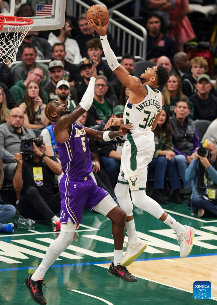Milwaukee Bucks' Giannis Antetokounmpo (front) shoots during the 2025-2026 NBA regular season game between Milwaukee Bucks and Los Angeles Lakers in Milwaukee, the United States, on Nov. 15, 2025. (Photo by Joel Lerner/Xinhua)