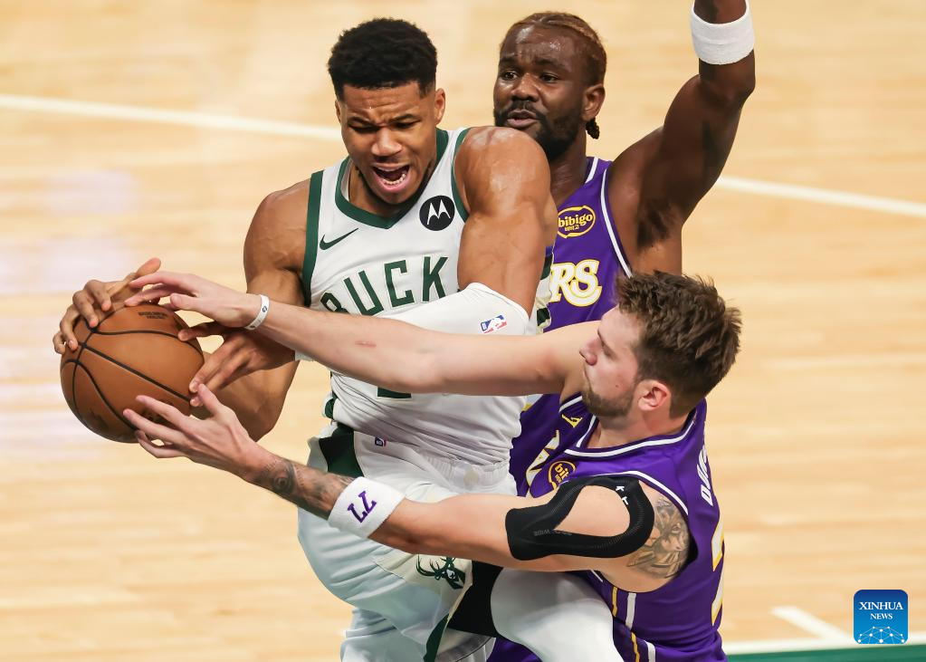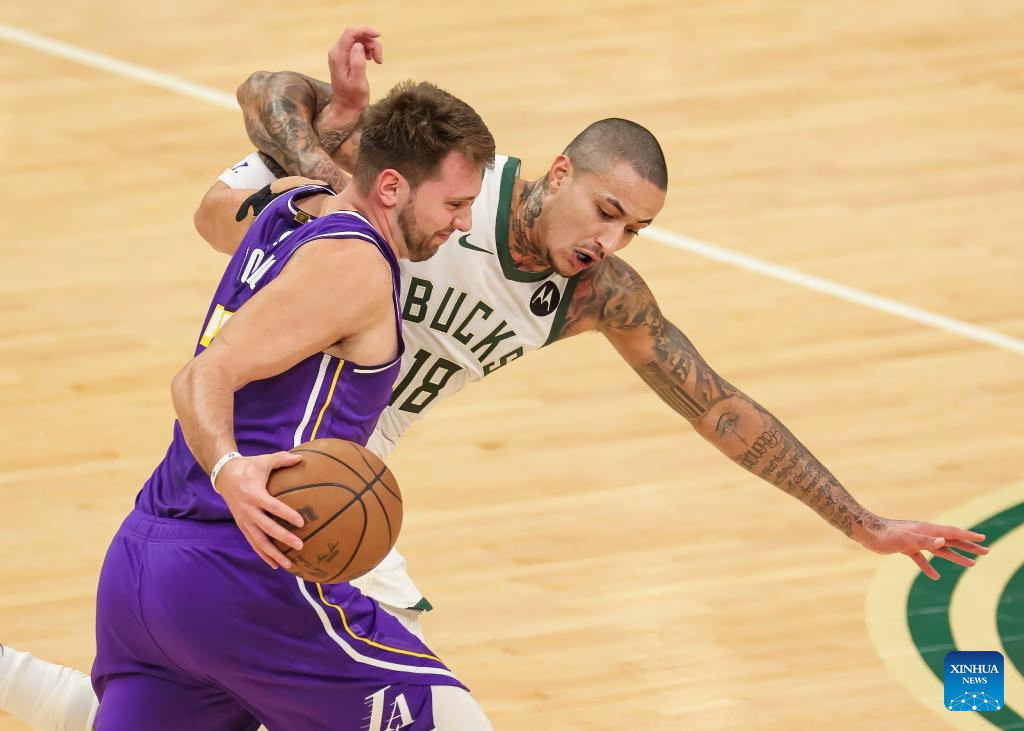 Milwaukee Bucks' Giannis Antetokounmpo (L) vies with Los Angeles Lakers' Luka Doncic (R) during the 2025-2026 NBA regular season game between Milwaukee Bucks and Los Angeles Lakers in Milwaukee, the United States, on Nov. 15, 2025. (Photo by Joel Lerner/Xinhua)
