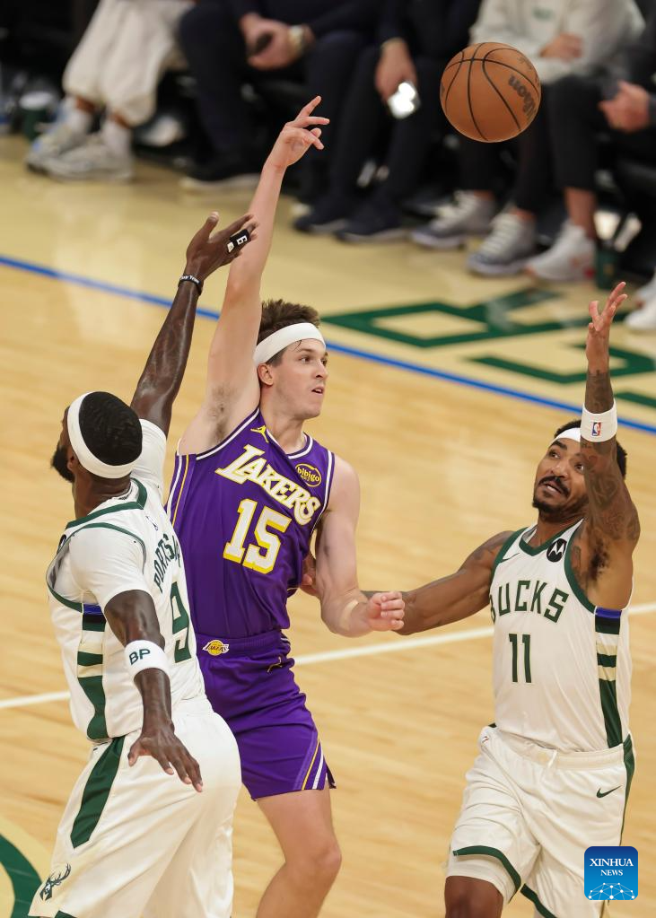 Los Angeles Lakers' Austin Reaves (C) passes the ball during the 2025-2026 NBA regular season game between Milwaukee Bucks and Los Angeles Lakers in Milwaukee, the United States, on Nov. 15, 2025. (Photo by Joel Lerner/Xinhua)