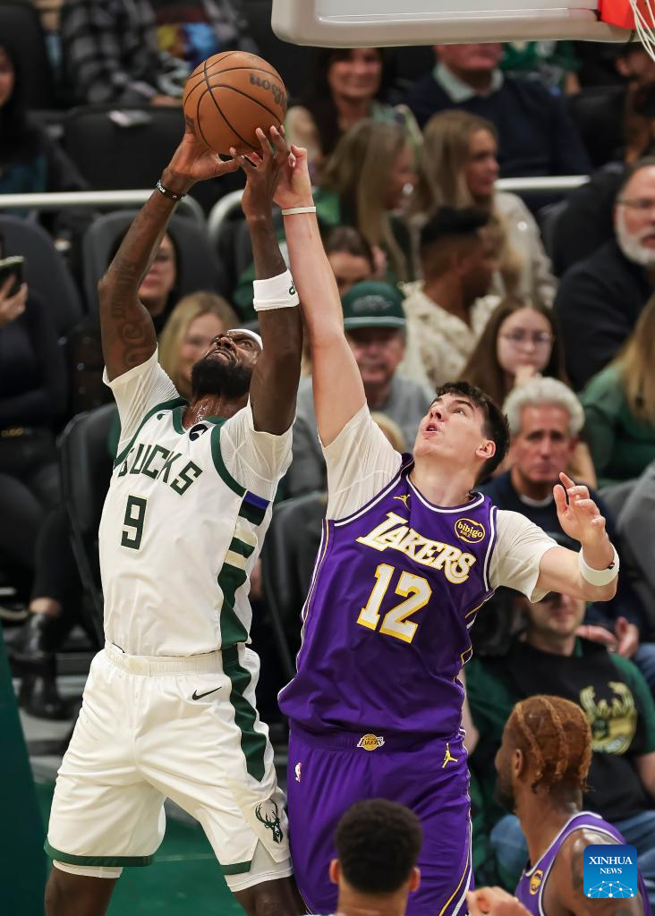 Milwaukee Bucks' Bobby Portis (L) vies with Los Angeles Lakers' Jake Laravia during the 2025-2026 NBA regular season game between Milwaukee Bucks and Los Angeles Lakers in Milwaukee, the United States, on Nov. 15, 2025. (Photo by Joel Lerner/Xinhua)