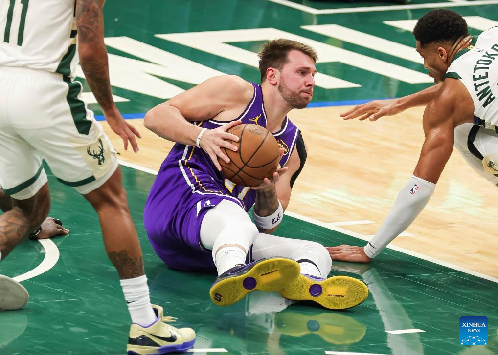 Los Angeles Lakers' Luka Doncic (C) competes during the 2025-2026 NBA regular season game between Milwaukee Bucks and Los Angeles Lakers in Milwaukee, the United States, on Nov. 15, 2025. (Photo by Joel Lerner/Xinhua)