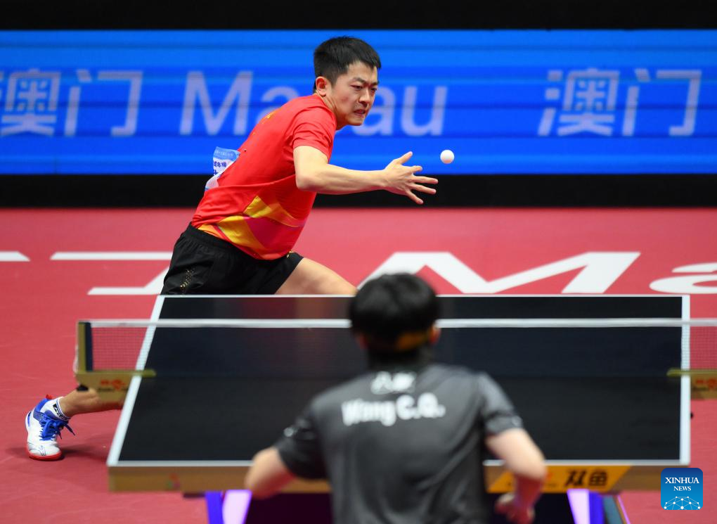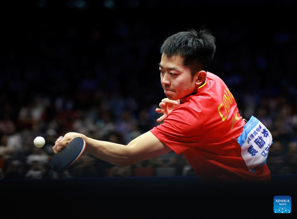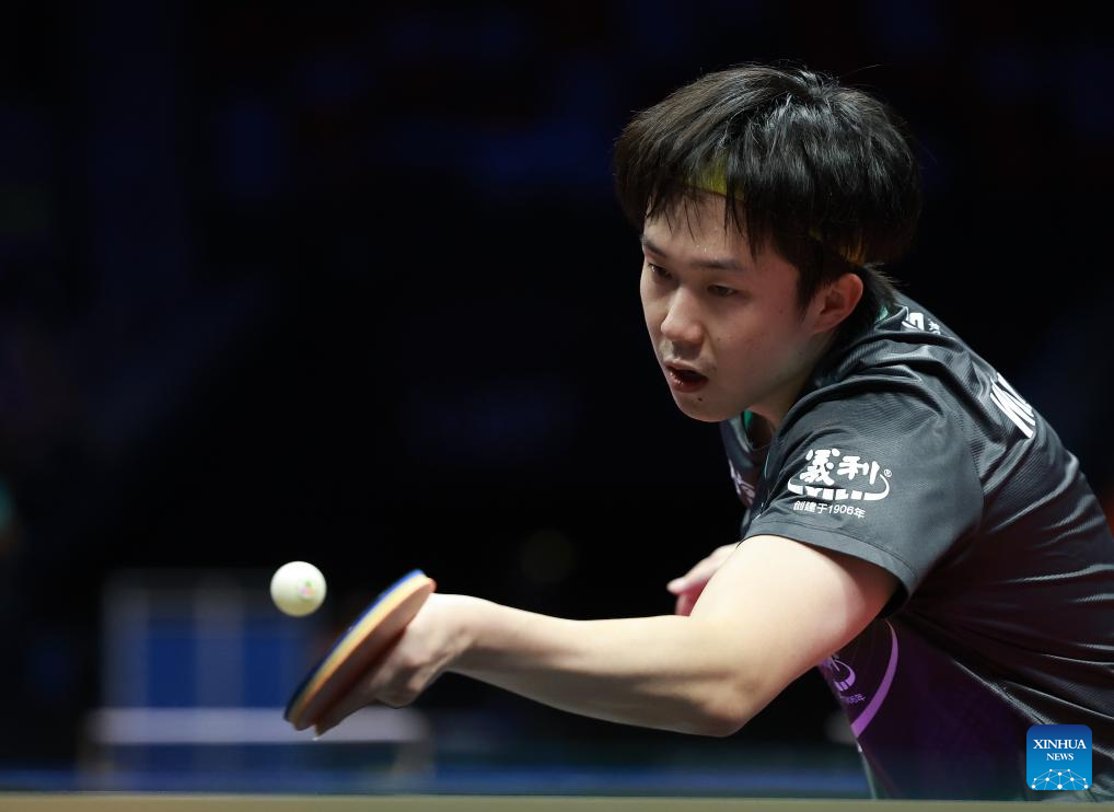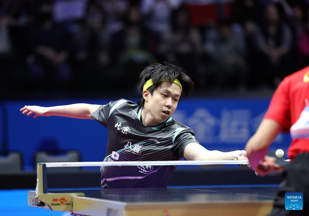 Wang Chuqin competes during the men's singles bronze medal match of table tennis between Wang Chuqin of Beijing and Yuan Licen of Liaoning at China's 15th National Games in Macao, south China, Nov. 16, 2025. (Xinhua/Cheong Kam Ka)