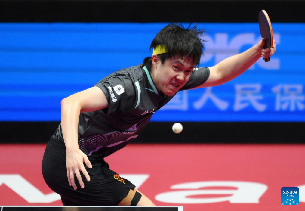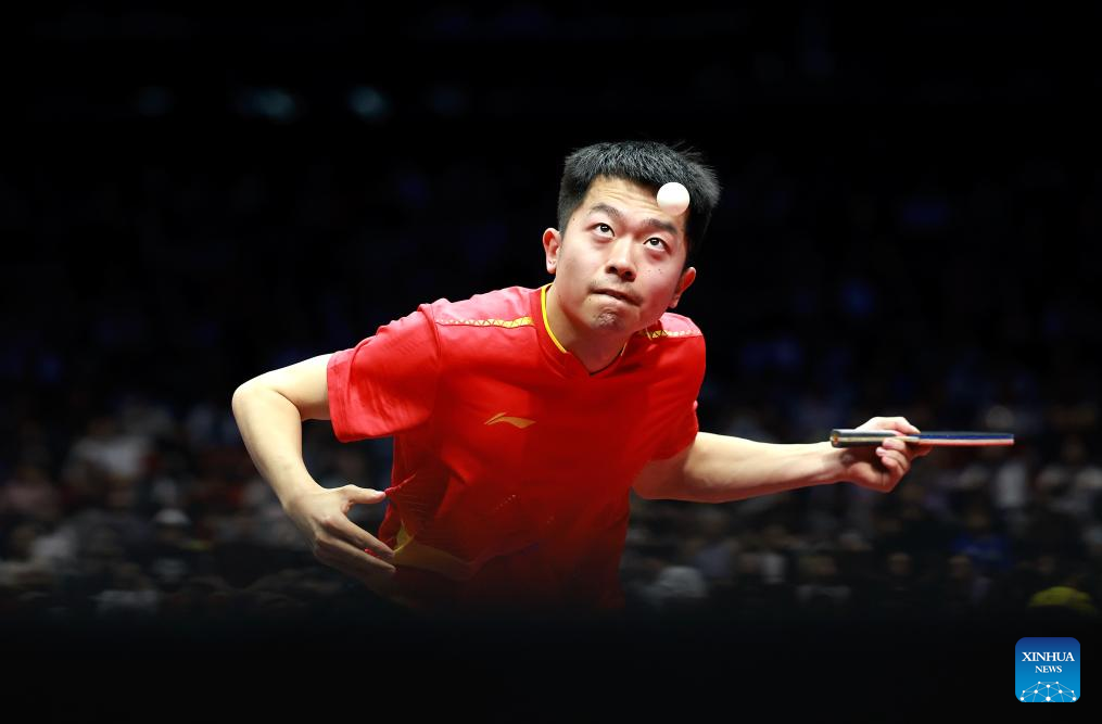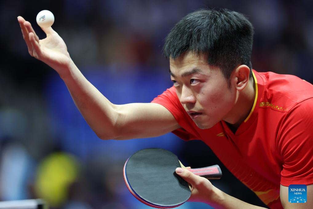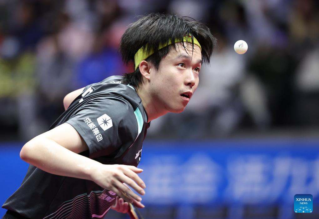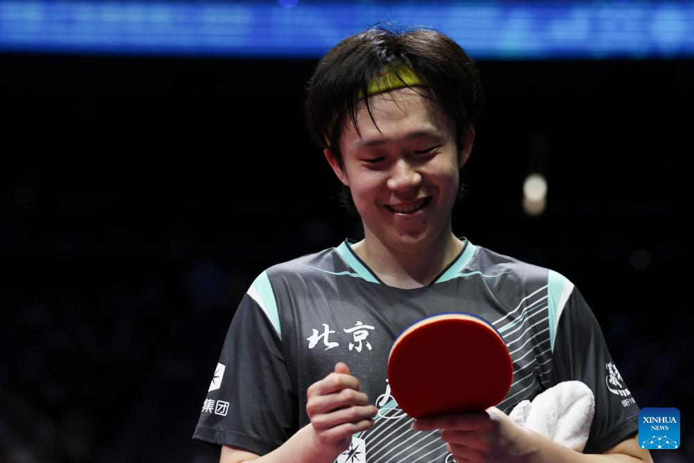 Wang Chuqin competes during the men's singles bronze medal match of table tennis between Wang Chuqin of Beijing and Yuan Licen of Liaoning at China's 15th National Games in Macao, south China, Nov. 16, 2025. (Xinhua/Cheong Kam Ka)
