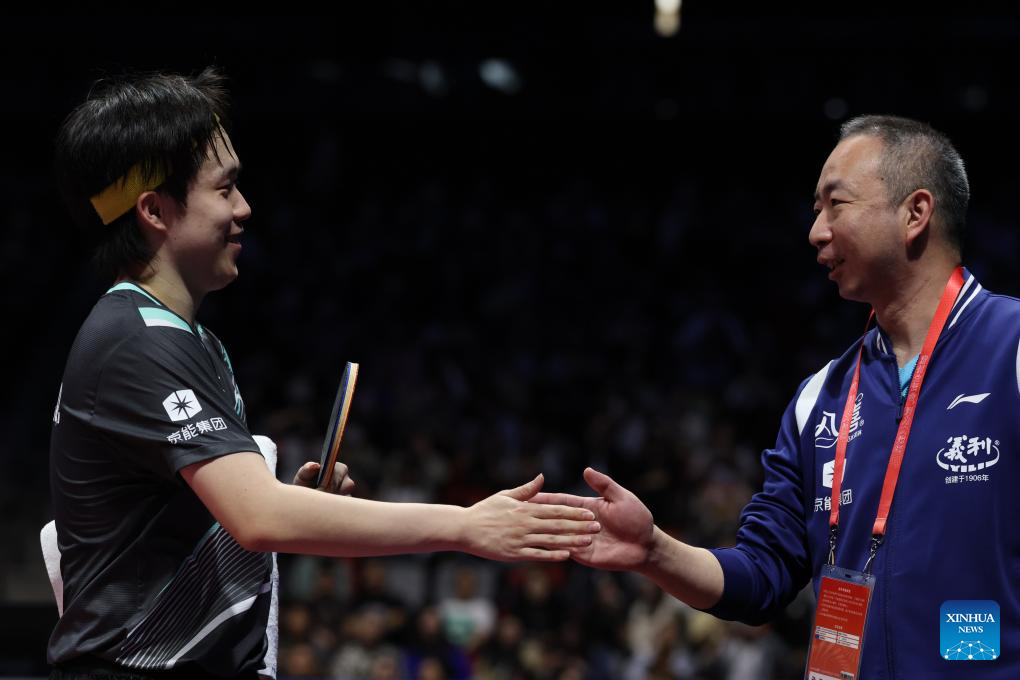 Wang Chuqin (L) shakes hands with his coach during the men's singles bronze medal match of table tennis between Wang Chuqin of Beijing and Yuan Licen of Liaoning at China's 15th National Games in Macao, south China, Nov. 16, 2025. (Xinhua/Liu Xu)