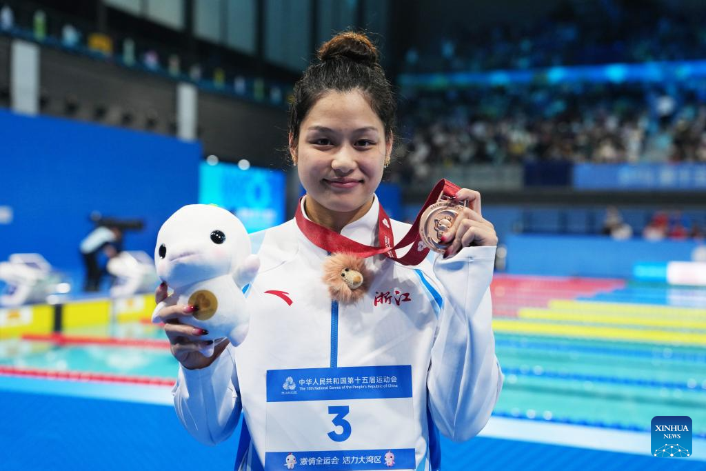 Bronze medalist Yu Yiting of Zhejiang poses after the awarding ceremony for the women's 50m butterfly of swimming at China's 15th National Games in Shenzhen, south China's Guangdong Province, Nov. 16, 2025. (Xinhua/Xia Yifang)