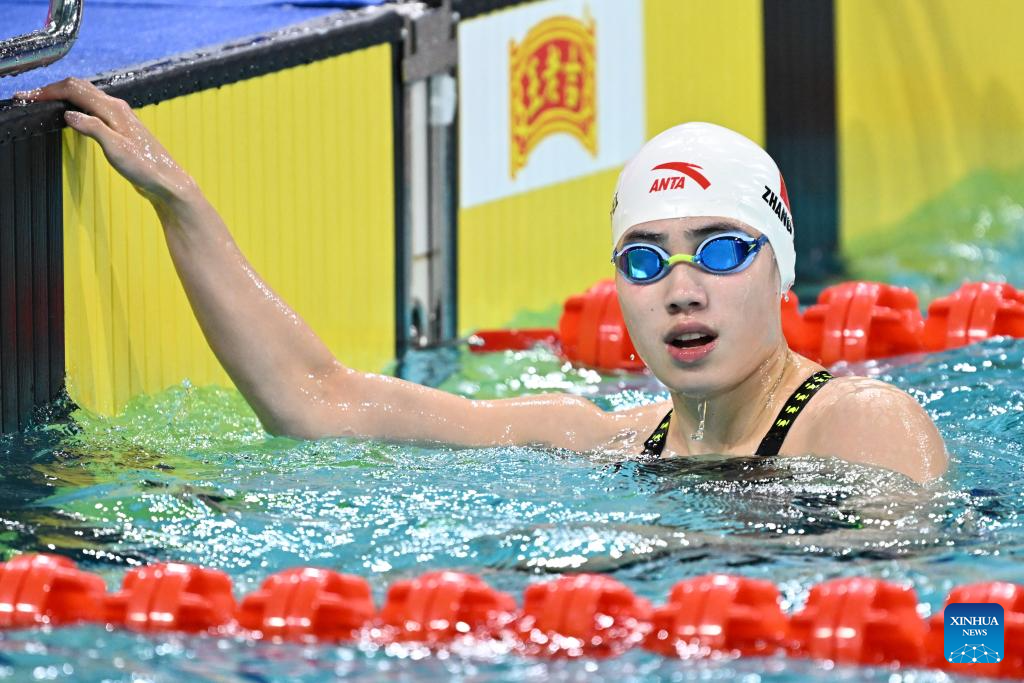 Zhang Yufei of Jiangsu reacts after the women's 50m freestyle semifinal of swimming at China's 15th National Games in Shenzhen, south China's Guangdong Province, Nov. 16, 2025. (Xinhua/Du Yu)