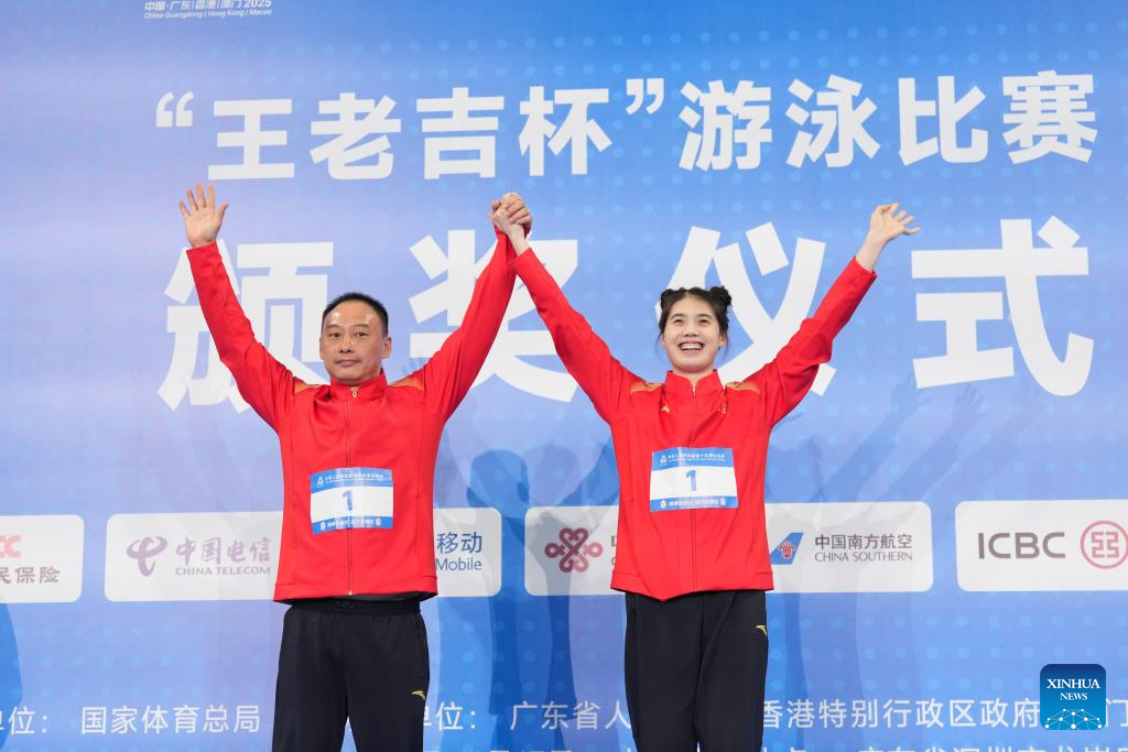 Gold medalist Zhang Yufei of Jiangsu and her coach wave during the awarding ceremony for the women's 50m butterfly of swimming at China's 15th National Games in Shenzhen, south China's Guangdong Province, Nov. 16, 2025. (Xinhua/Tenzin Nyida)