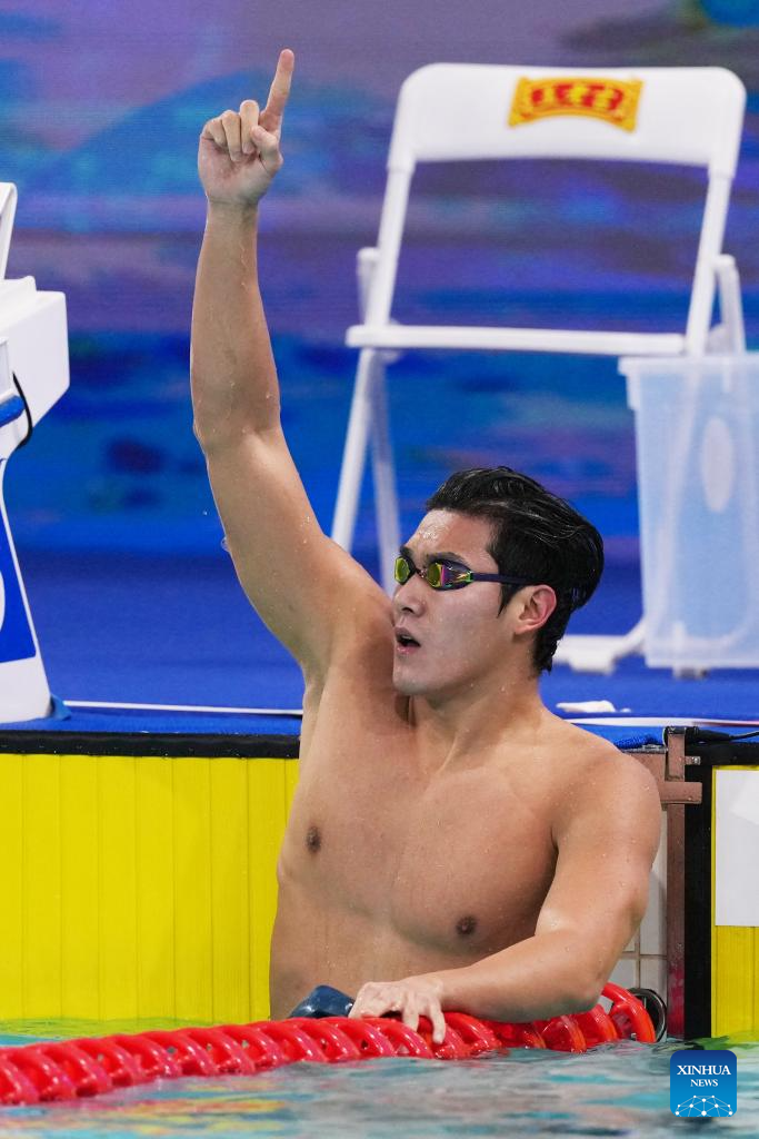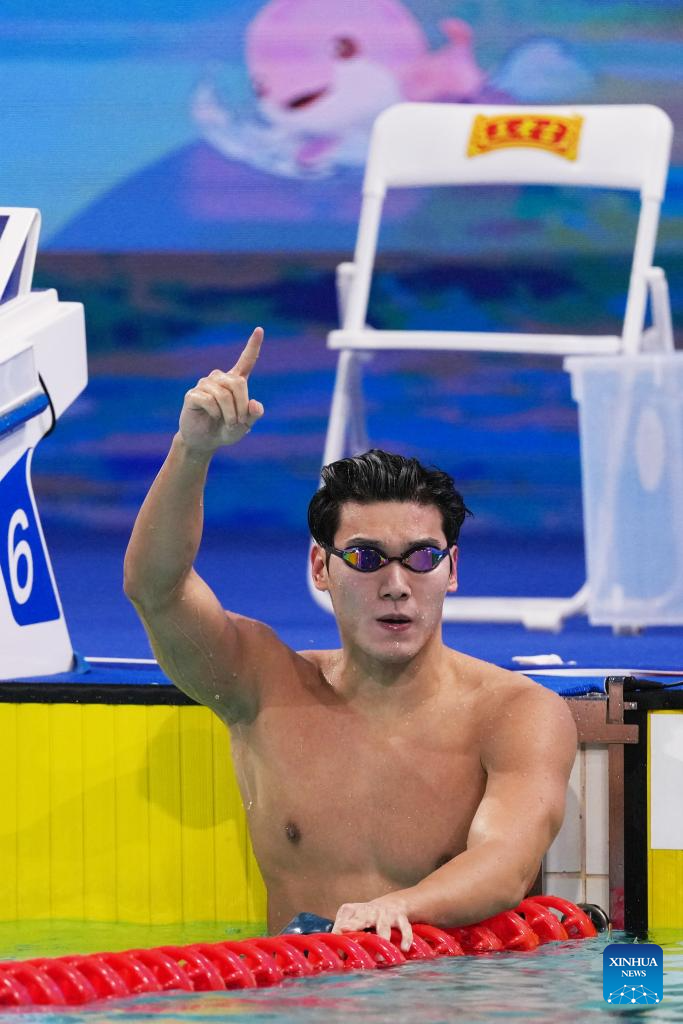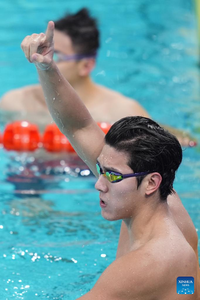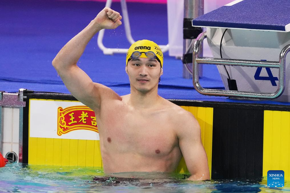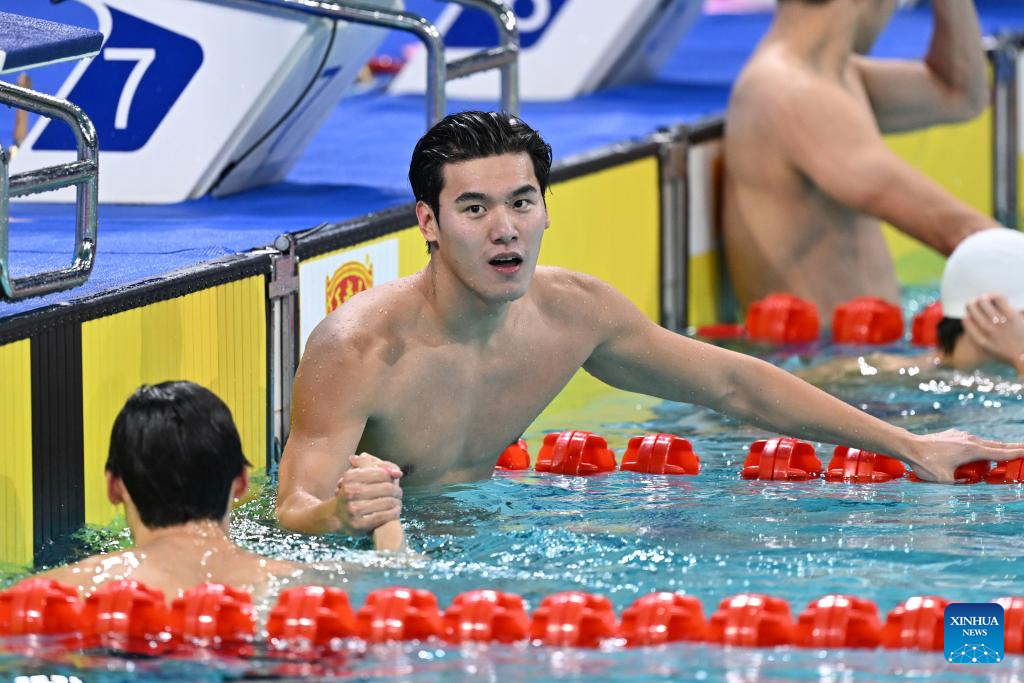 Xu Jiayu of Zhejiang reacts after the men's 50m backstroke preliminary of swimming at China's 15th National Games in Shenzhen, south China's Guangdong Province, Nov. 16, 2025. (Xinhua/Tenzin Nyida)
