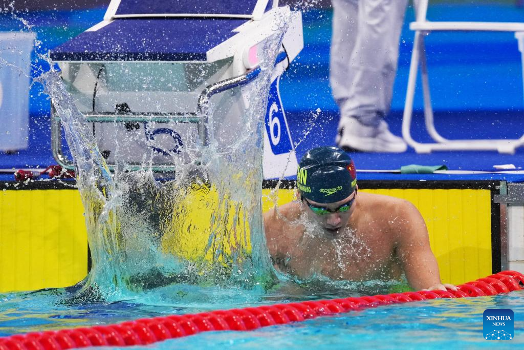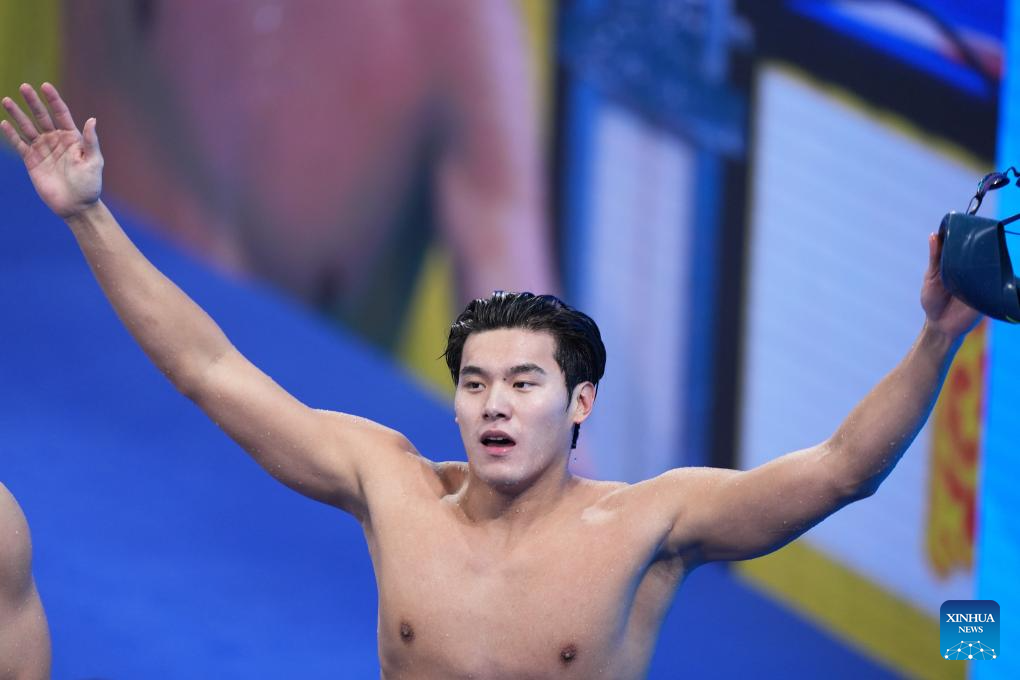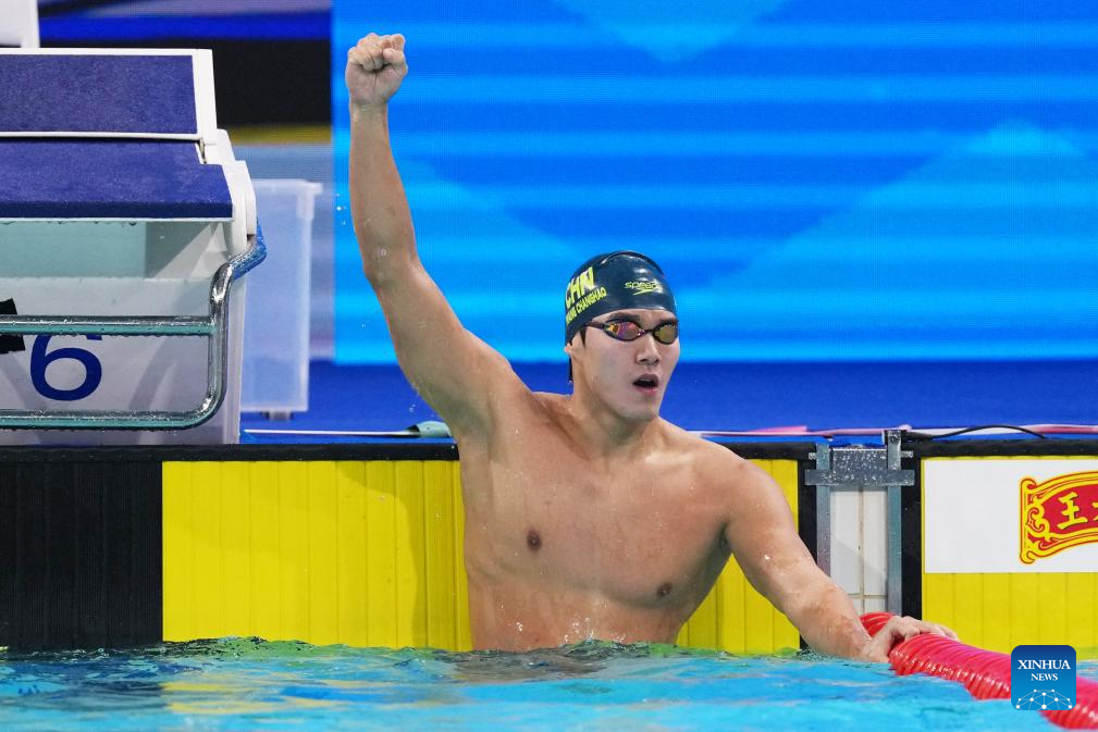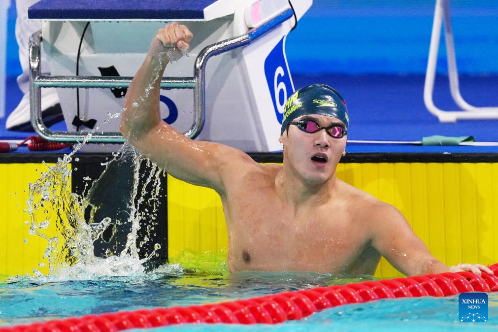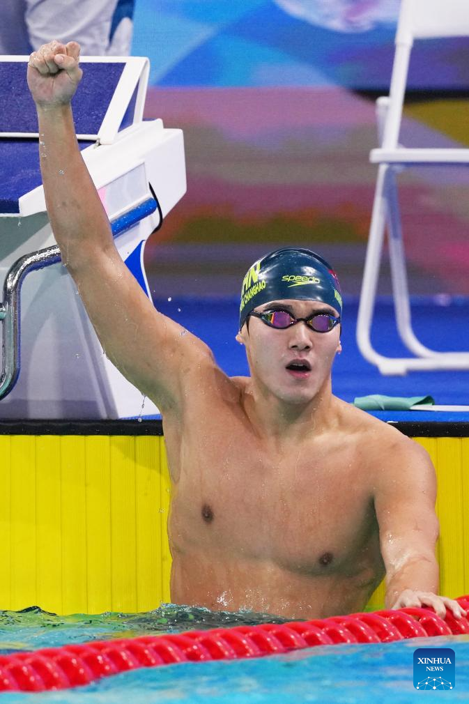 Xu Jiayu of Zhejiang reacts after the men's 50m backstroke preliminary of swimming at China's 15th National Games in Shenzhen, south China's Guangdong Province, Nov. 16, 2025. (Xinhua/Tenzin Nyida)