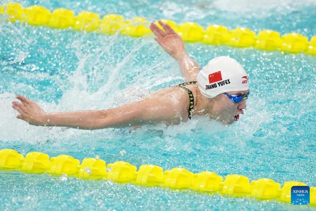 Zhang Yufei of Jiangsu competes during the women's 50m butterfly final of swimming at China's 15th National Games in Shenzhen, south China's Guangdong Province, Nov. 16, 2025. (Xinhua/Du Yu)
