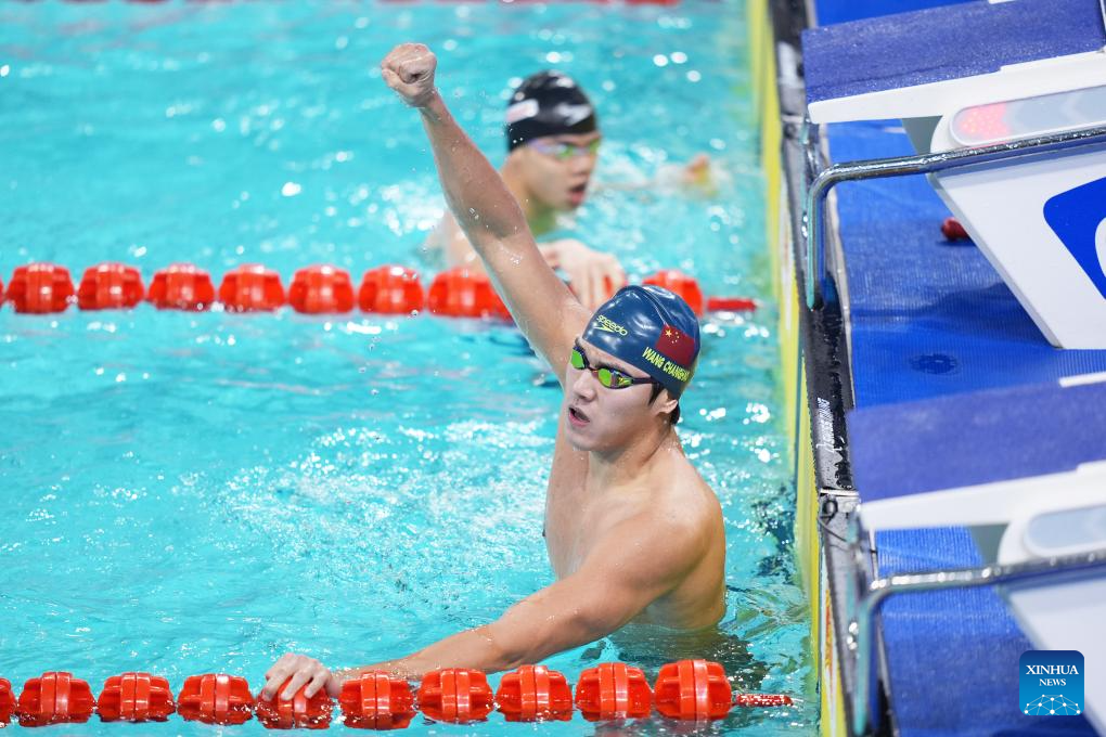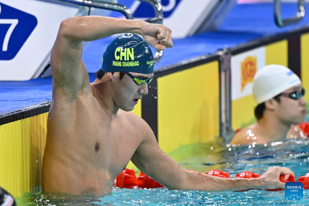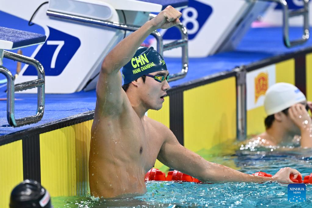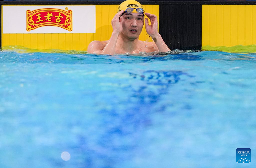 Wang Changhao of Tianjin reacts after the men's 100m butterfly final of swimming at China's 15th National Games in Shenzhen, south China's Guangdong Province, Nov. 16, 2025. (Xinhua/Tenzin Nyida)
