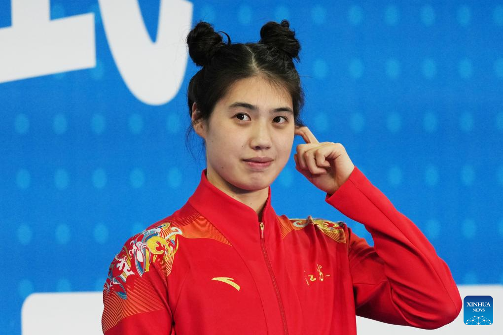 Gold medalist Zhang Yufei of Jiangsu reacts during the awarding ceremony for the women's 50m butterfly of swimming at China's 15th National Games in Shenzhen, south China's Guangdong Province, Nov. 16, 2025. (Xinhua/Tenzin Nyida)