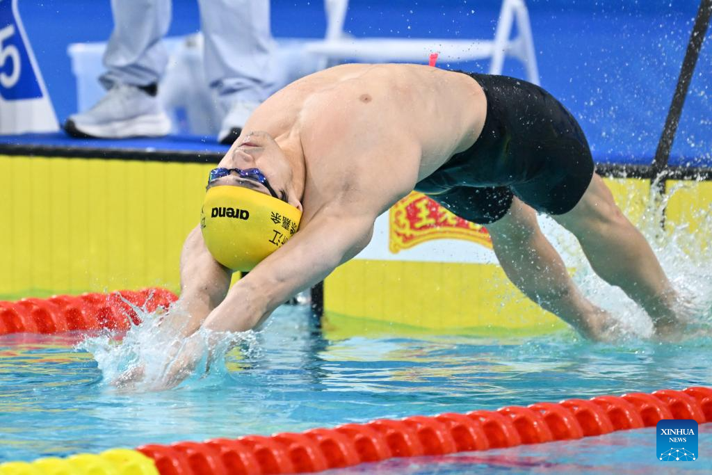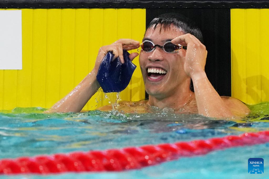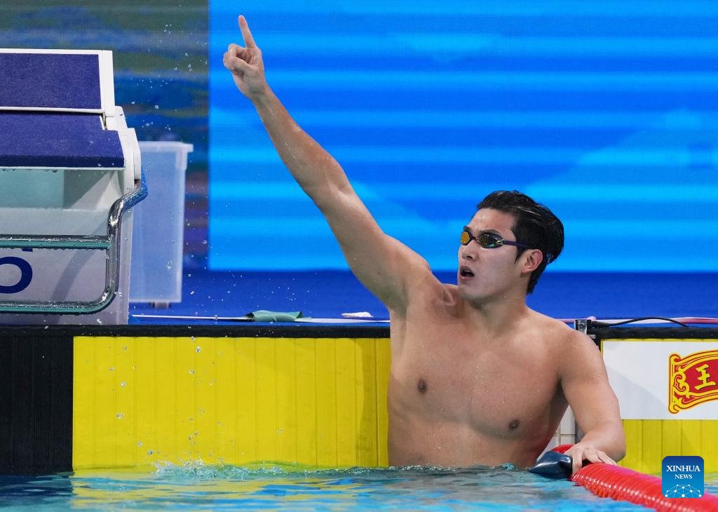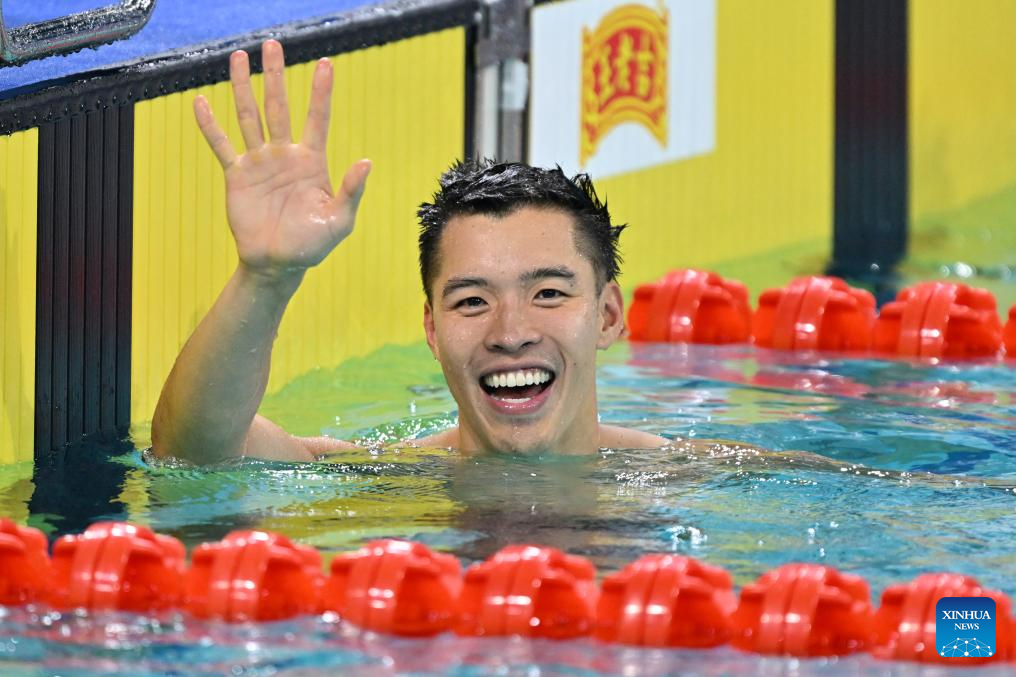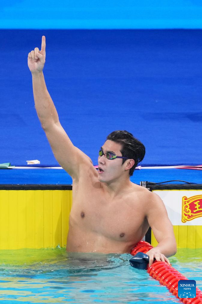 Ho Ian Yentou of Hong Kong reacts after the men's 50m freestyle final of swimming at China's 15th National Games in Shenzhen, south China's Guangdong Province, Nov. 16, 2025. (Xinhua/Chen Yichen)