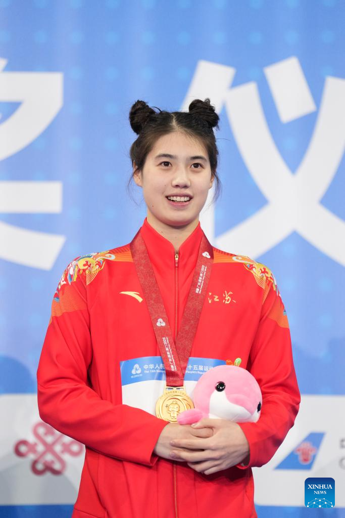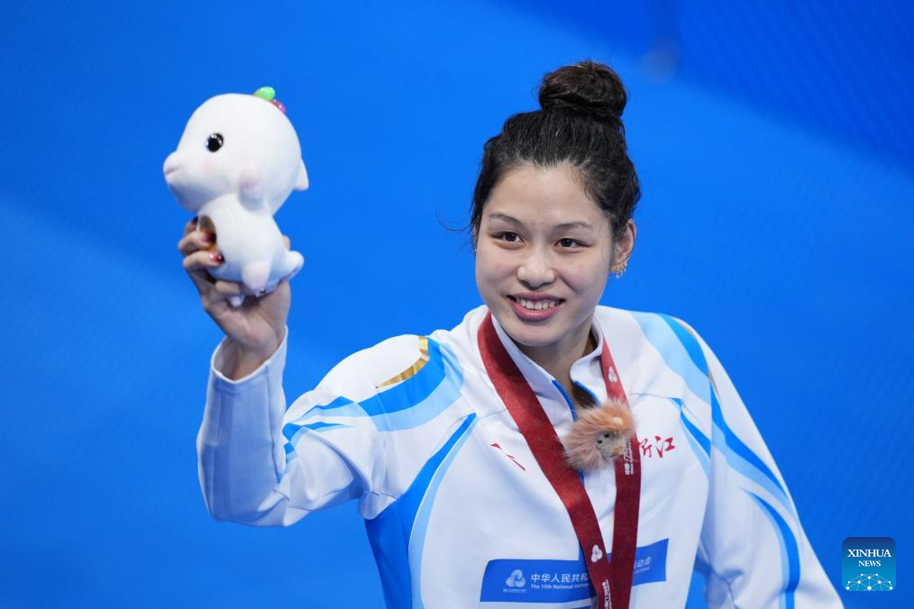 Gold medalist Zhang Yufei of Jiangsu poses during the awarding ceremony for the women's 50m butterfly of swimming at China's 15th National Games in Shenzhen, south China's Guangdong Province, Nov. 16, 2025. (Xinhua/Tenzin Nyida)